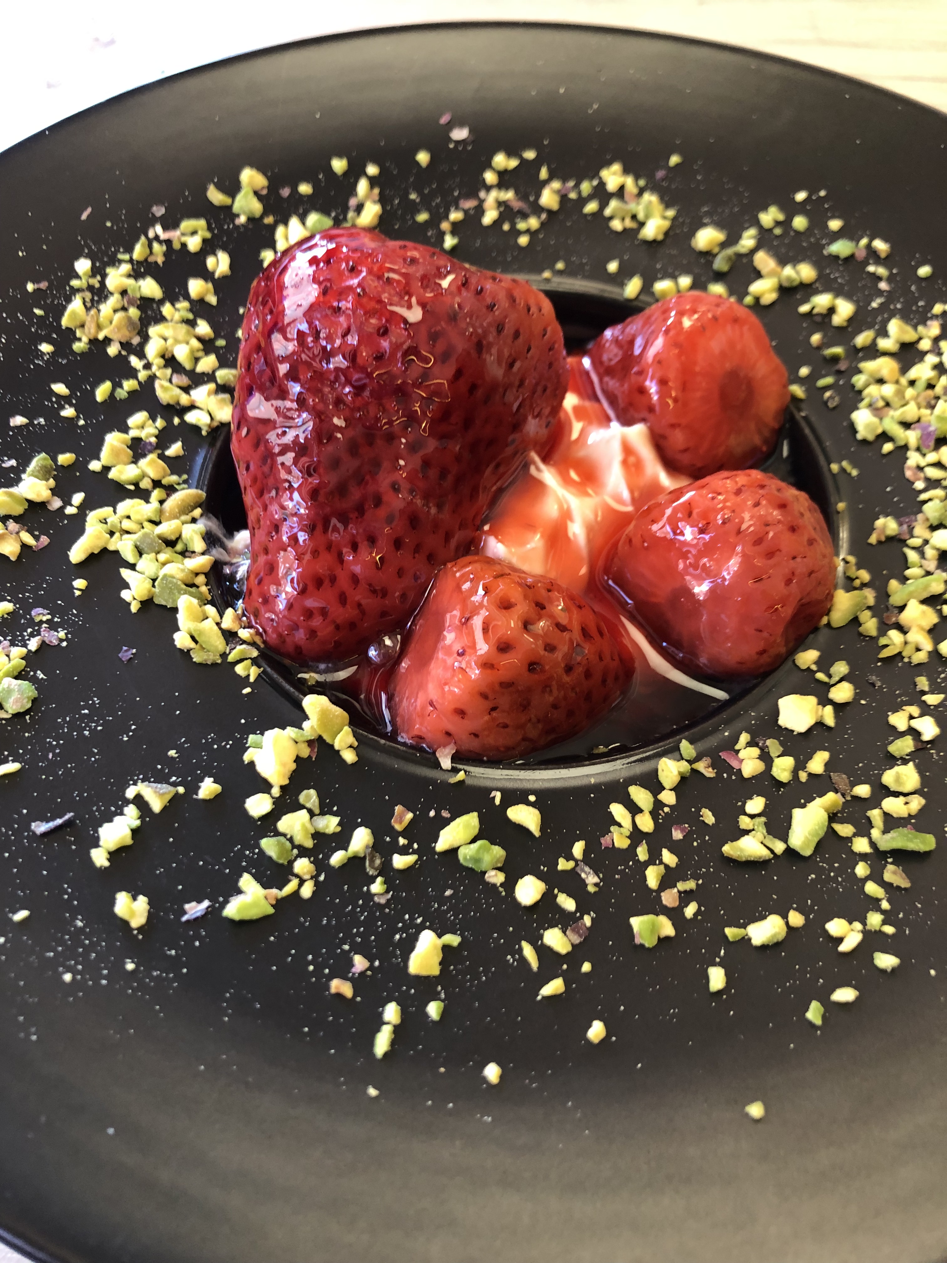 Deliciosas estas Fresas escabechadas con yogurt griego de chocolate blanco y pistacho