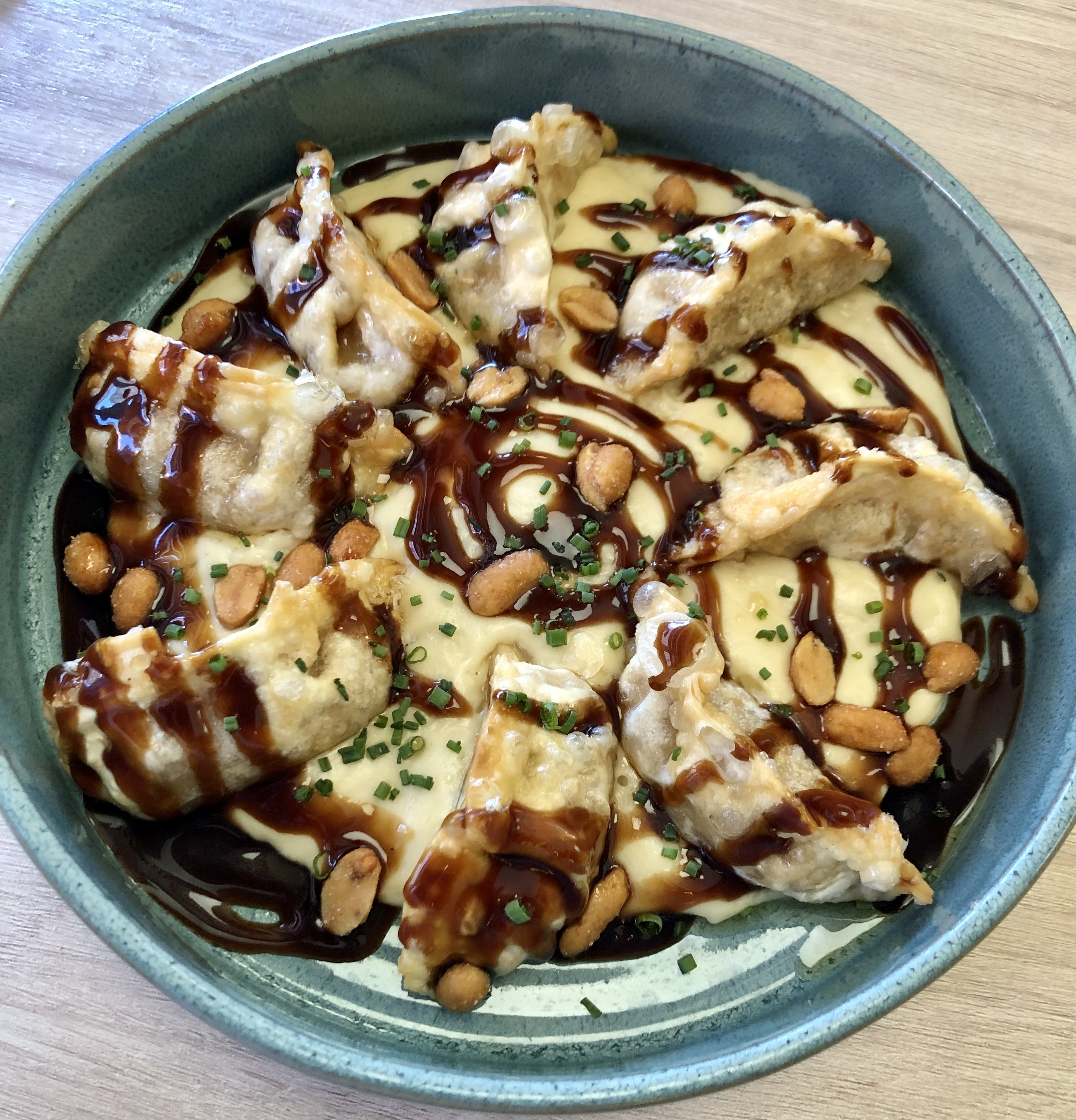 Entre los entrantes unas riquísimas Gyozas de pato fritas con verduras, parmentier, hoisin y cacahuetes, ración generosa que recomiendo compartir