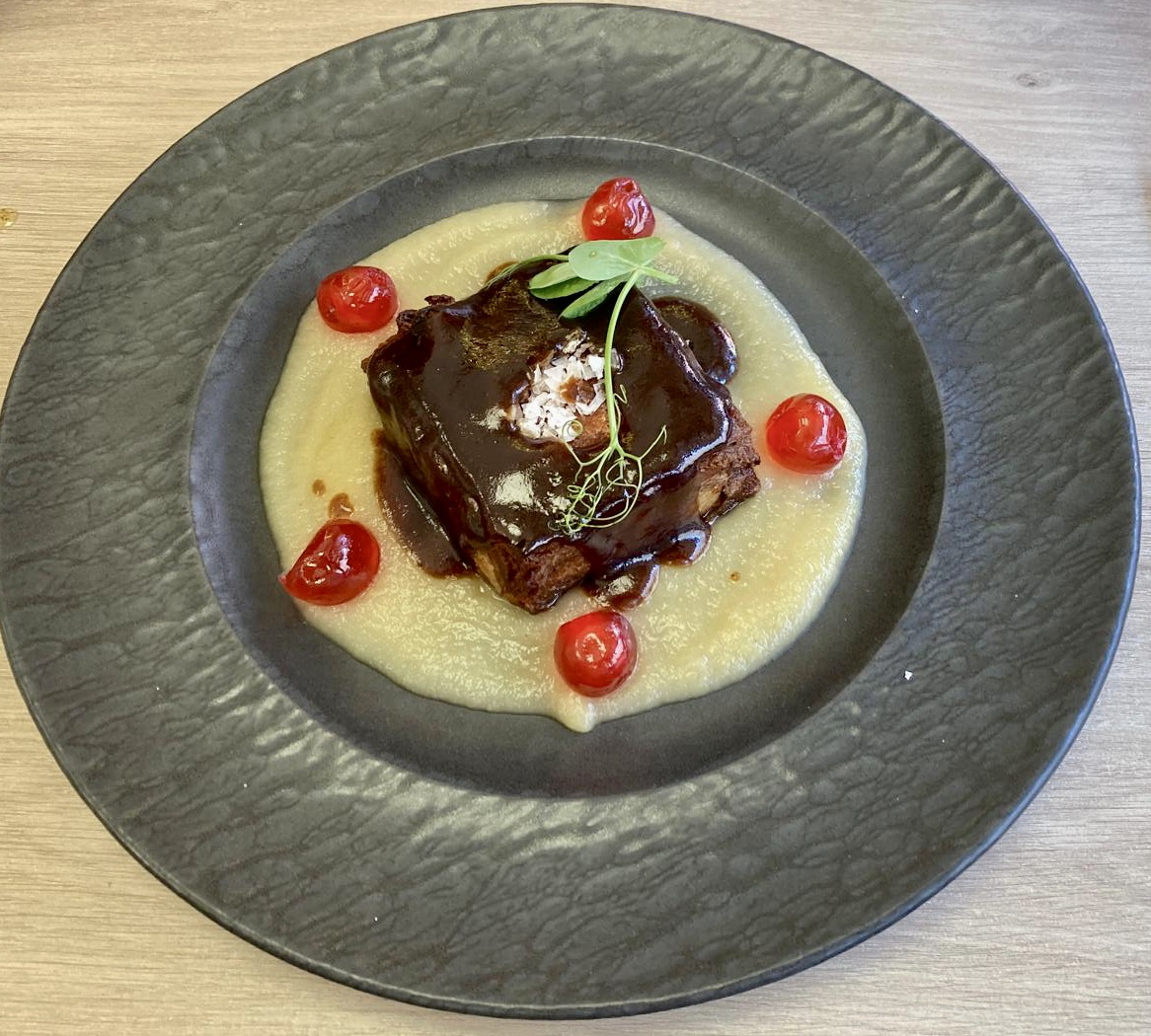 Meloso, disfrutón es su Taco de cochinillo deshuesado, puré de manzana, cerezas en almíbar y patatas fritas, con ese detalle de las cerezas en almíbar que le dan un toque tan espectacular