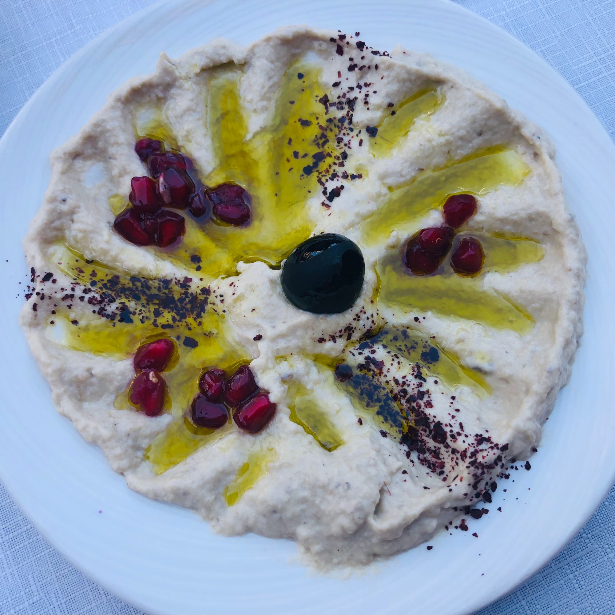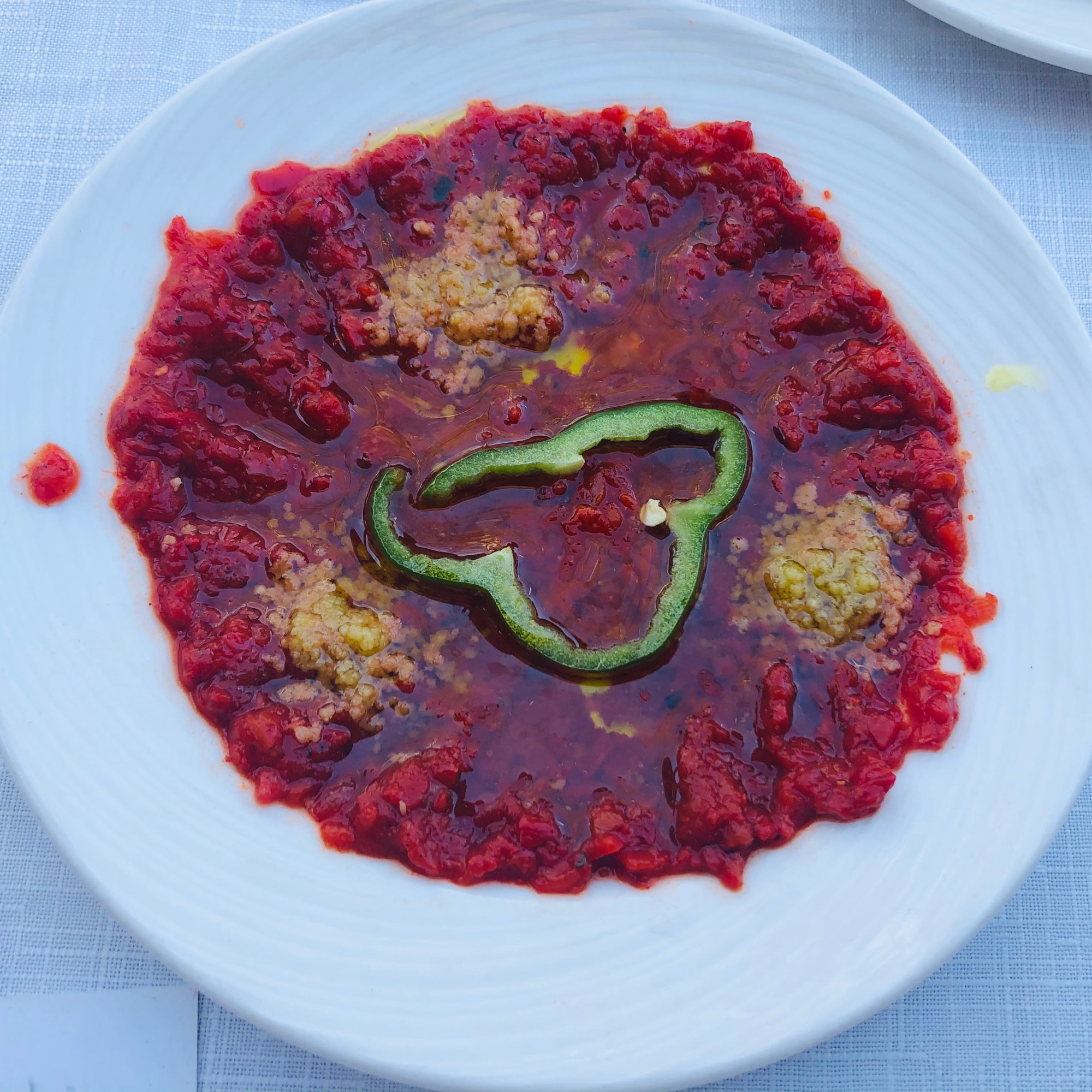 Mutabal, una crema de berenjena ahumada con Tahini y ajo y Muhammarah, pimientos asados cremosos con Bulgur, nueces y sirope de granada