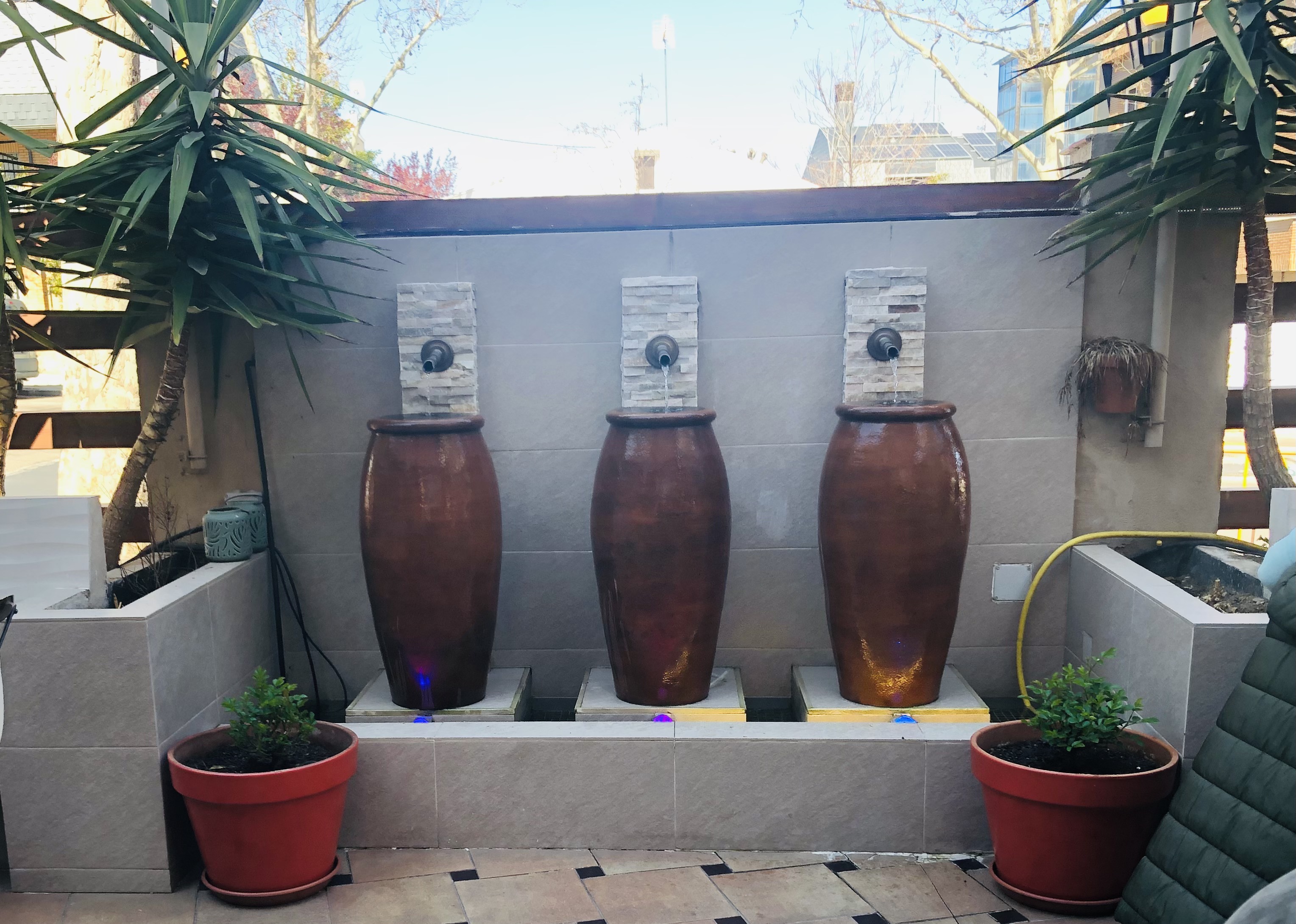 Destaca el detalle del relajante sonido del agua de su original fuente formada por tres antiguas tinajas, que imagino mágico en las noches de verano y que sin duda probaré en un futuro próximo.