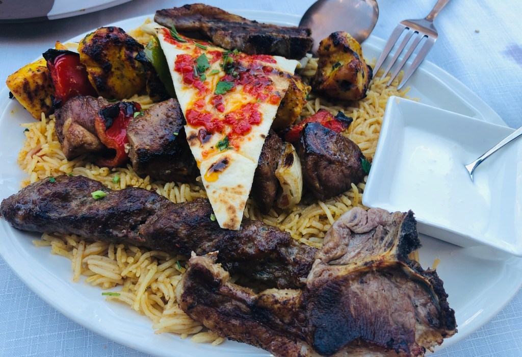 Una parrillada compuesta de una variedad de carnes, kebab, cordero, dados de pollo y chuletas de cordero servido con tomate y cebolla.