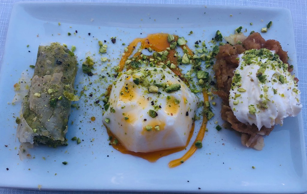 Aish Al Saraya, un pudin con sirope de azahar, cubierto de almendras, miel, nata y pistacho