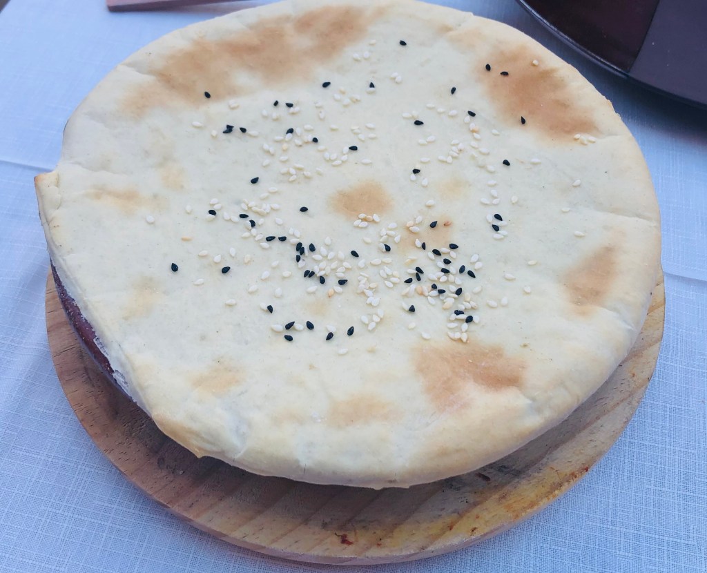 Una especie de pastel de carne picada de cordero cocinada con verduras en olla de barro y sellada con pan de pita, un plato sabroso y muy original.
