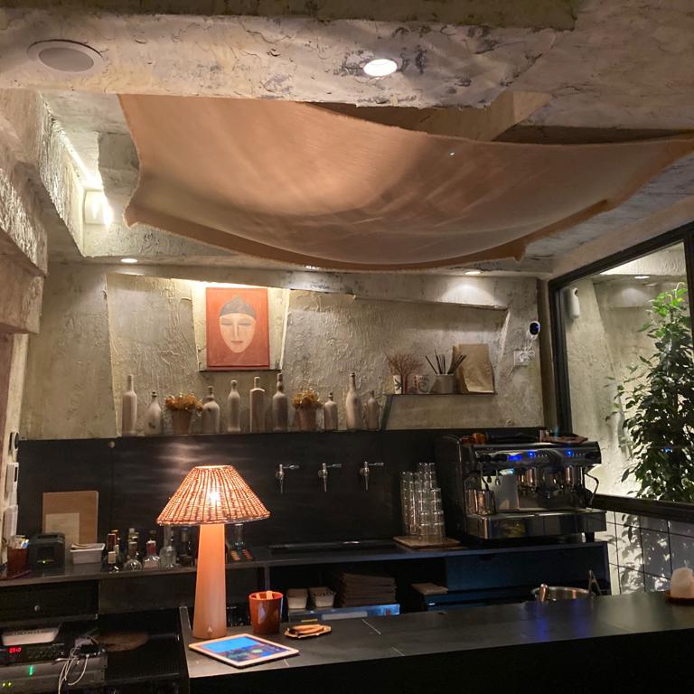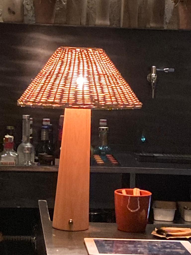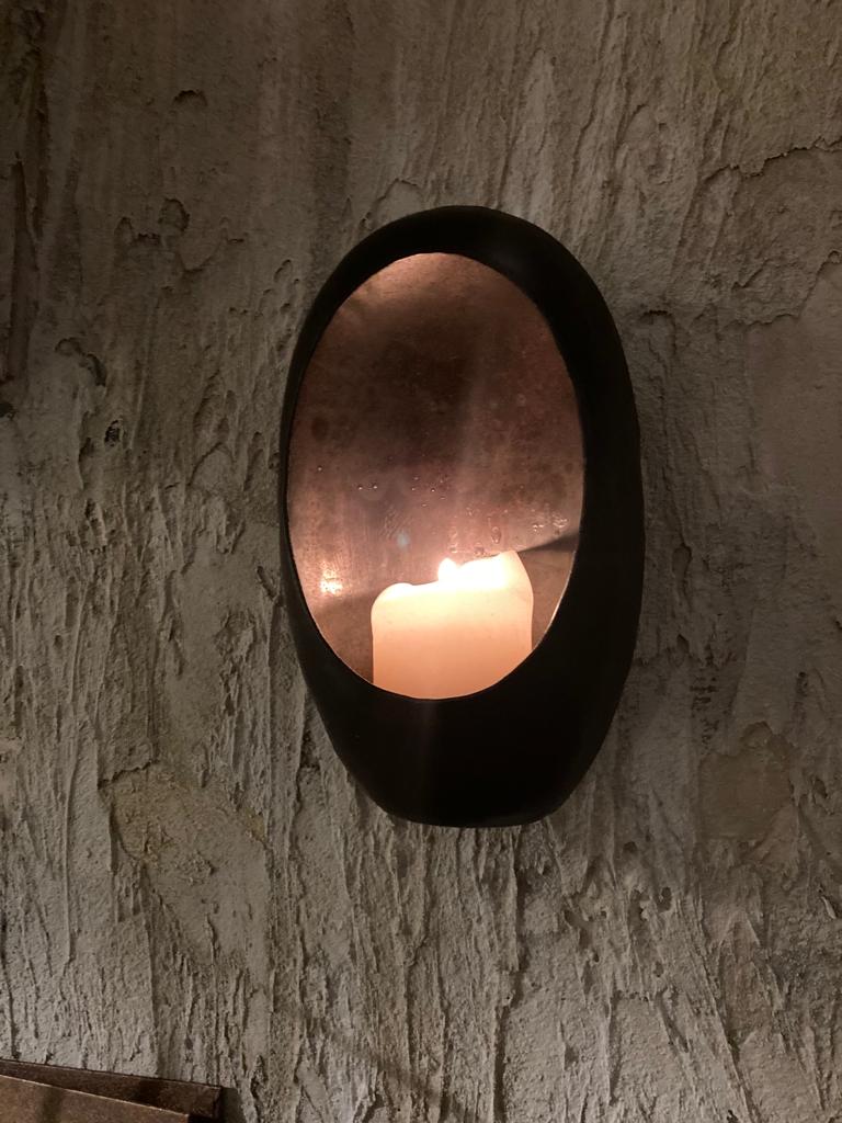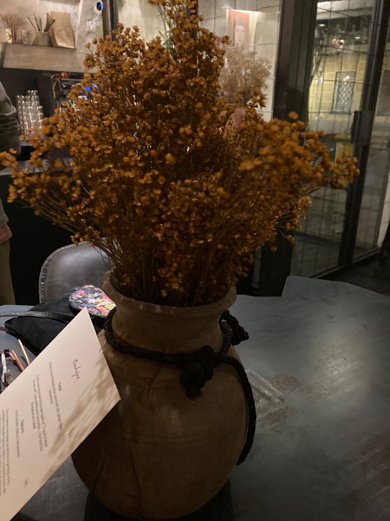 Los centros de flores secas, el barro en los portacubiertos, el esparto en los bajoplatos, la madera en las bandejas, una vajilla muy cuidada y variada. No falta un detalle, se ve que lo han hecho con mimo. Preciosos los apliques en la pared con una vela. La luz indirecta y tenue y las telas colgadas en el techo lo hacen más acogedor.