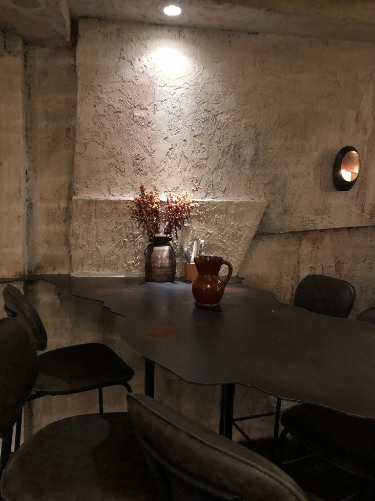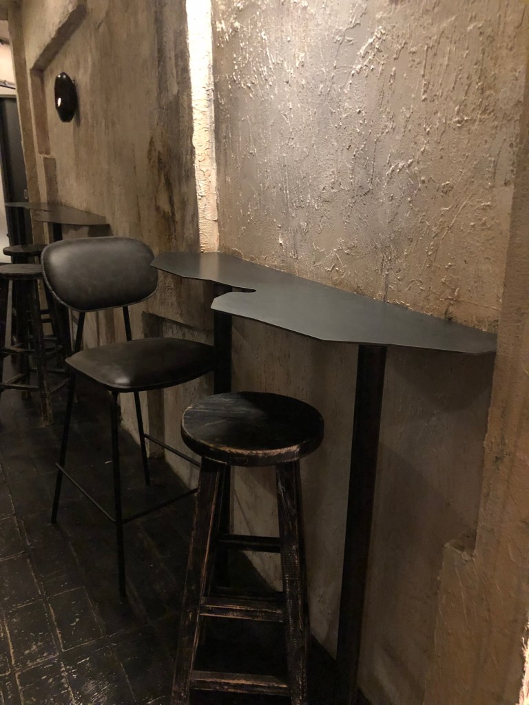 Nada más entrar en el local, impacta su decoración. Las paredes como bloques de cemento o piedra, con esas originales mesas metálicas simulando islas, mesas altas, cómodas para charlar y disfrutar de la comida, bebida y la sobremesa.