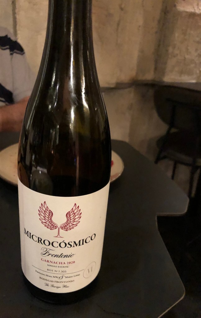 Lo regamos con una recomendación de Pedro un tinto Microcósmico de Bodegas Frontonio. Uva garnacha cultivada de forma sostenible, con procedimientos artesanos y poca producción, un vino diferente que combinó perfectamente con toda la cena.