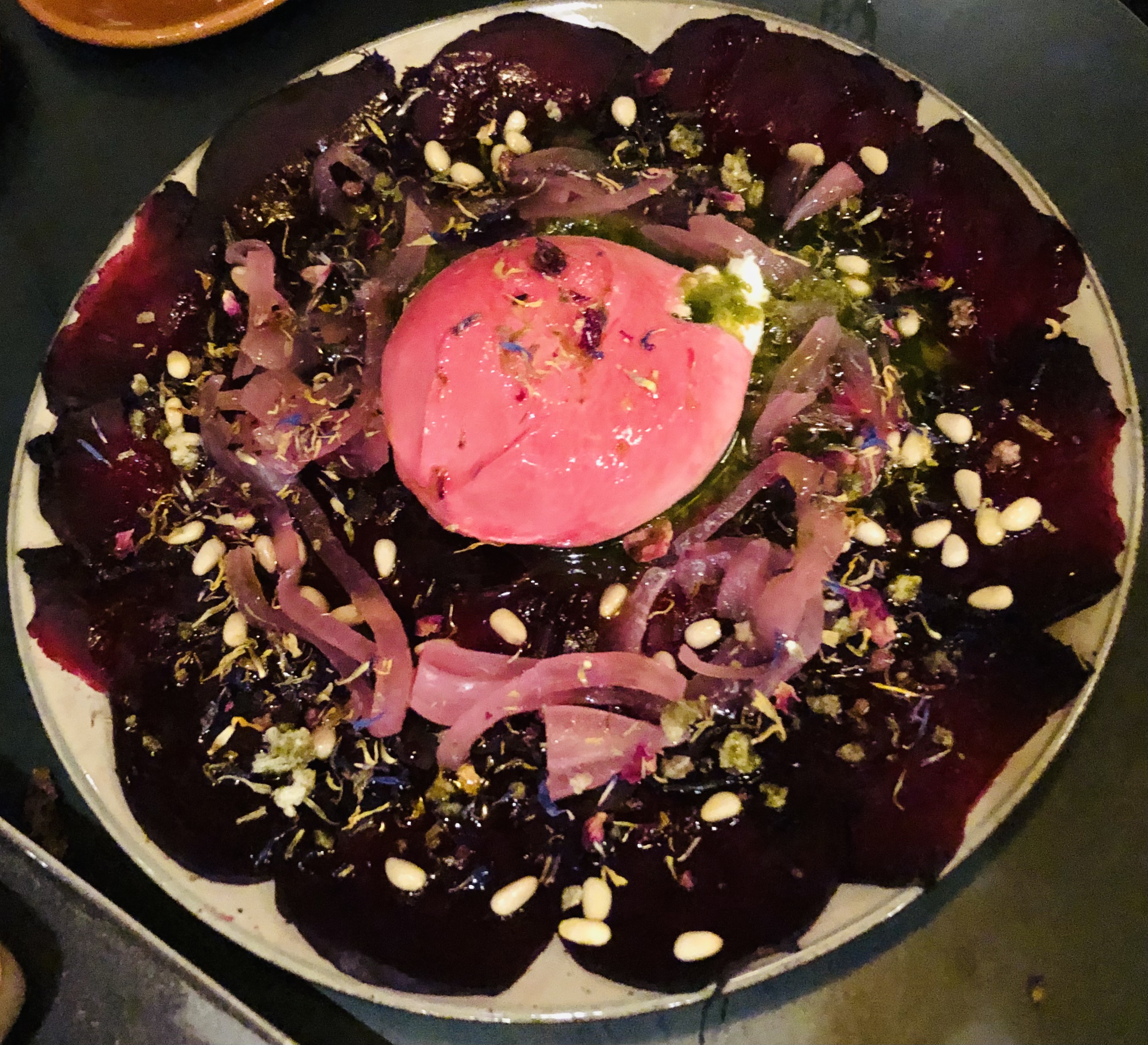Y también el Carpaccio de remolacha asada, burrata, cebolla encurtida y pesto de semillas de calabaza