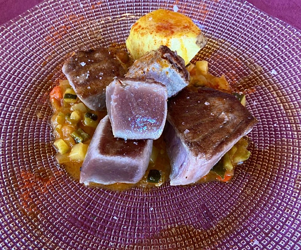 En su punto el Atún Rojo, presentado en daditos a la plancha con lagrimas de salsa brava y reducción de soja y miel.