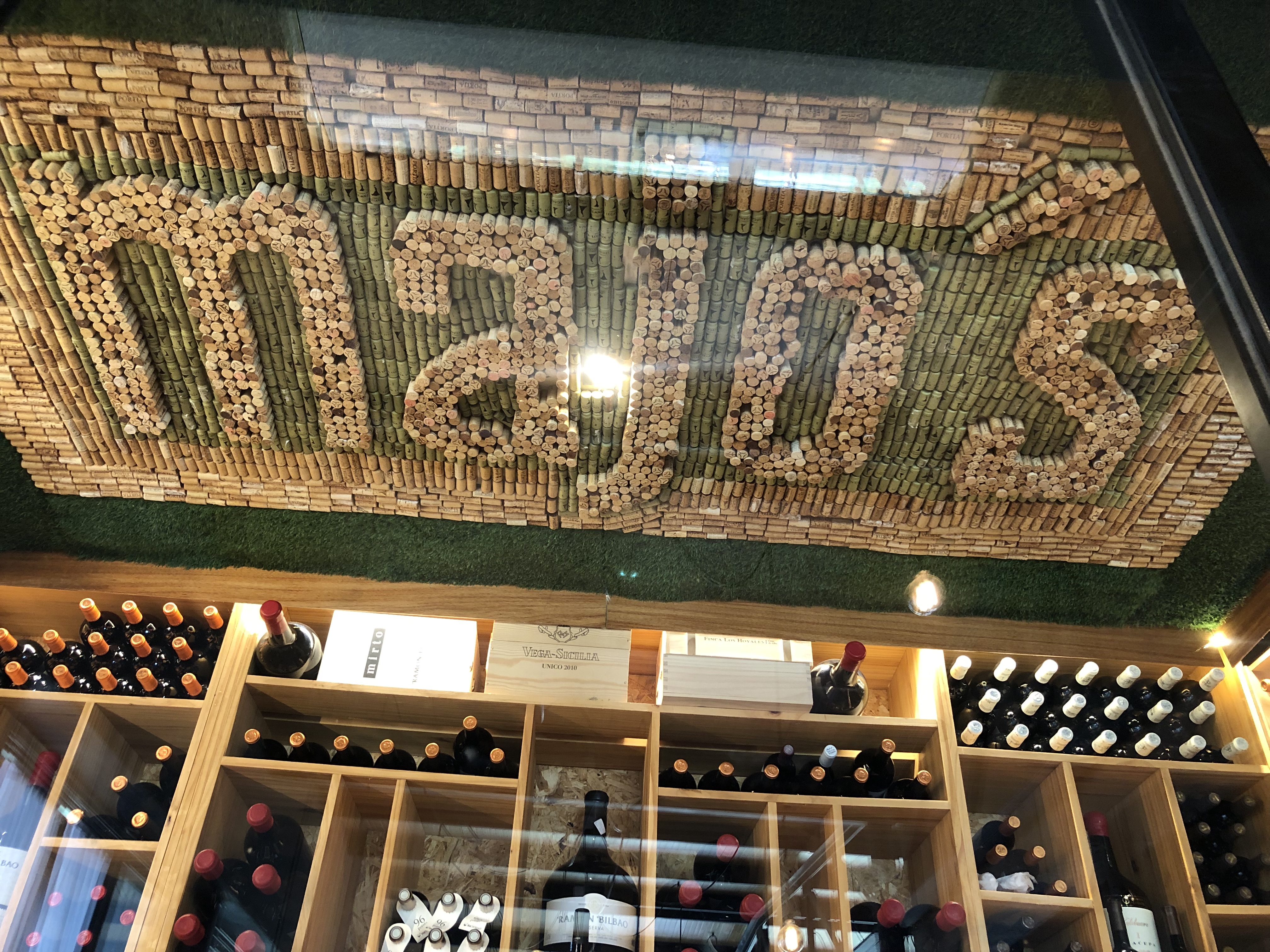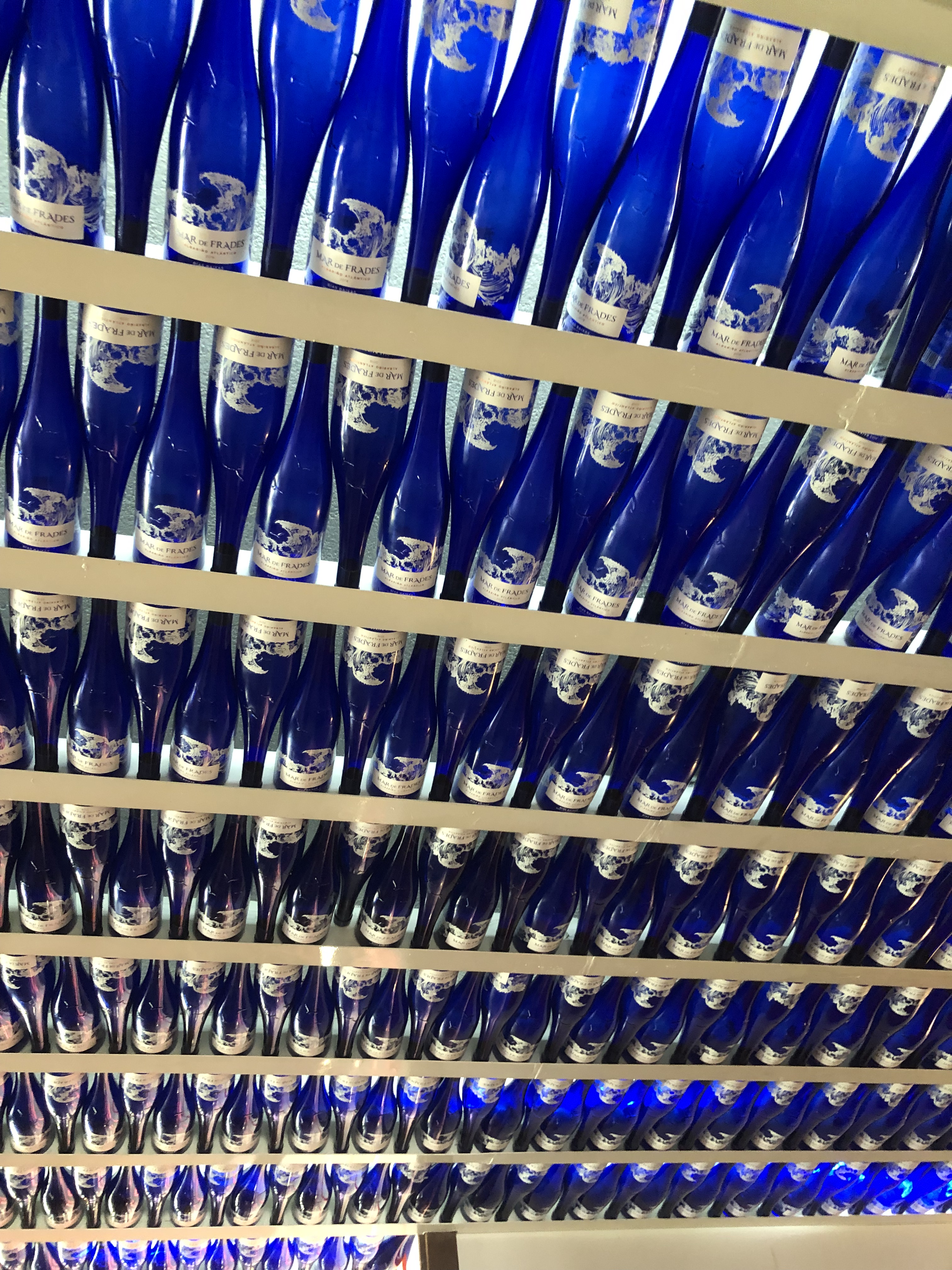 Originales también dos detalles en el techo de dos zonas, el nombre hecho con corchos de botellas en la bodega, y otra en la entrada, cubierta con botellas de Mar de Frades, curiosidad que llama mucho la atención.