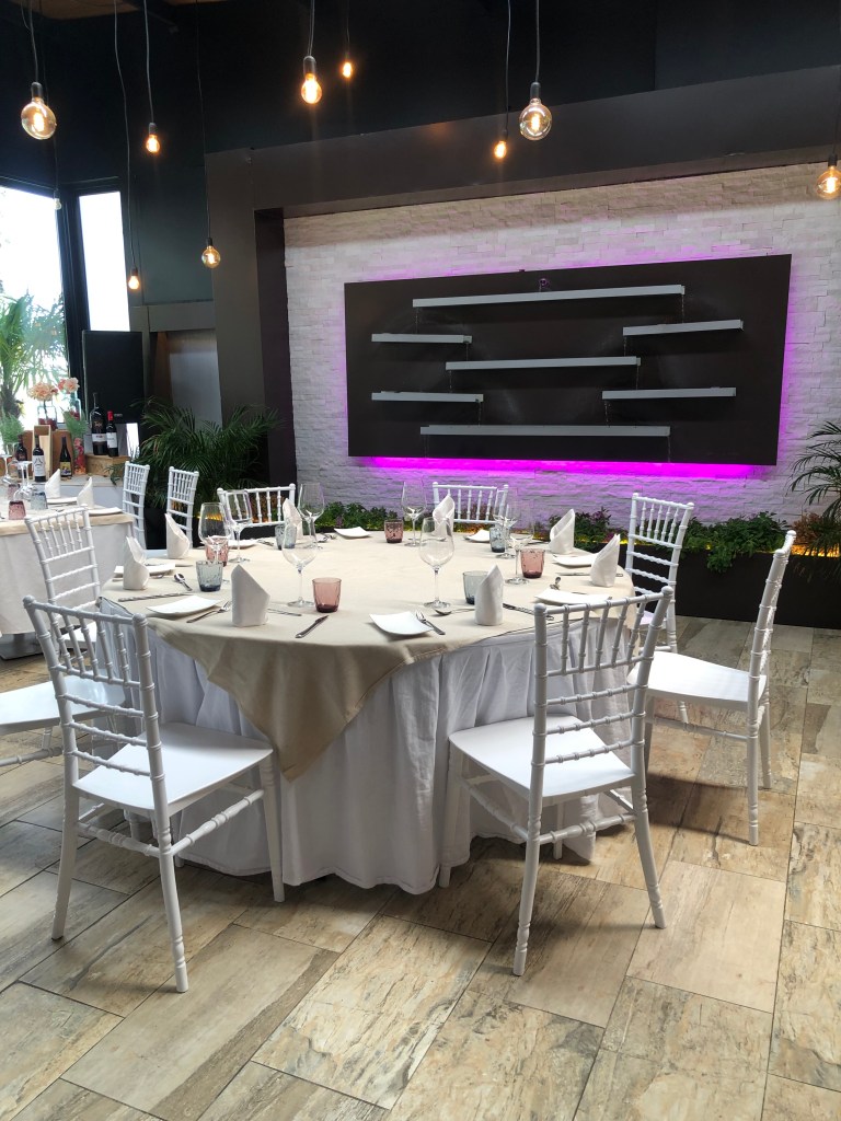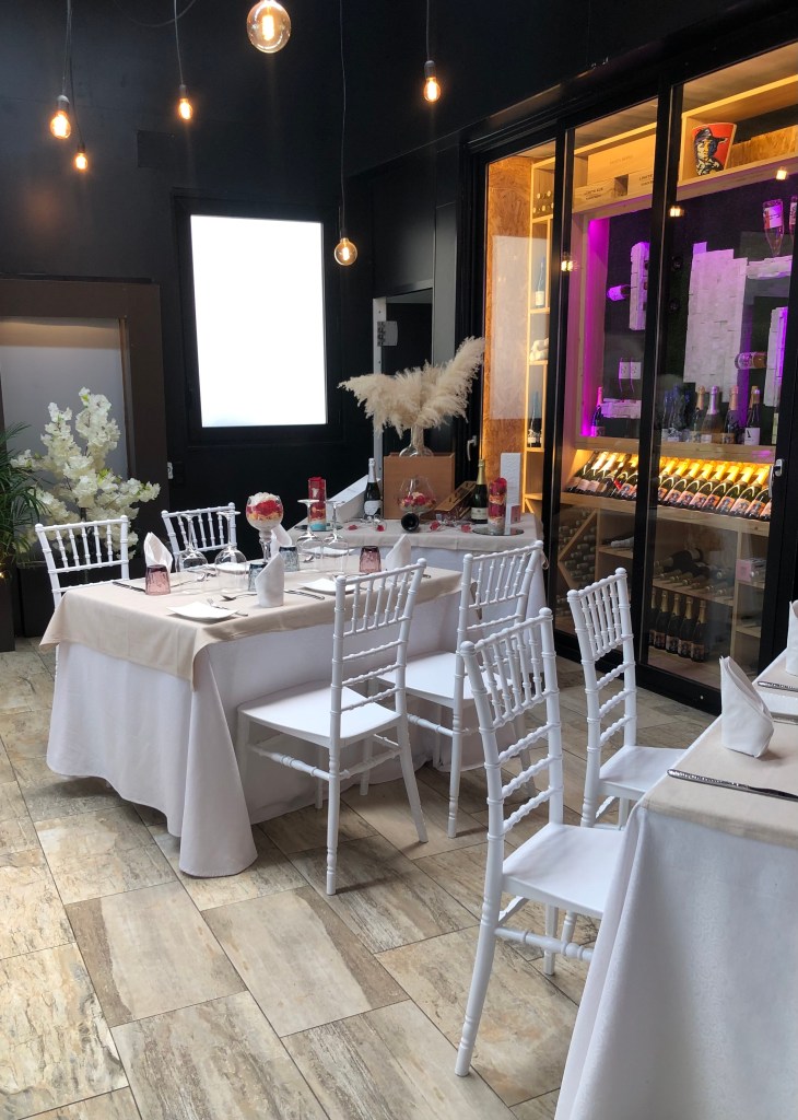 Una decoración con toques industriales con presencia de metal en columnas y techo y un moderno mobiliario, originales sillas en tono blanco y la madera en el solado que junto con las mesas vestidas le da una cierta calidez al conjunto.