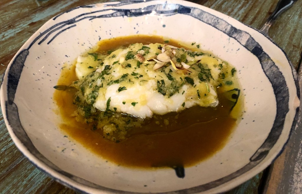 También probamos un Bacalao confitado a baja temperatura sobre crema de patata y ajetes crujientes