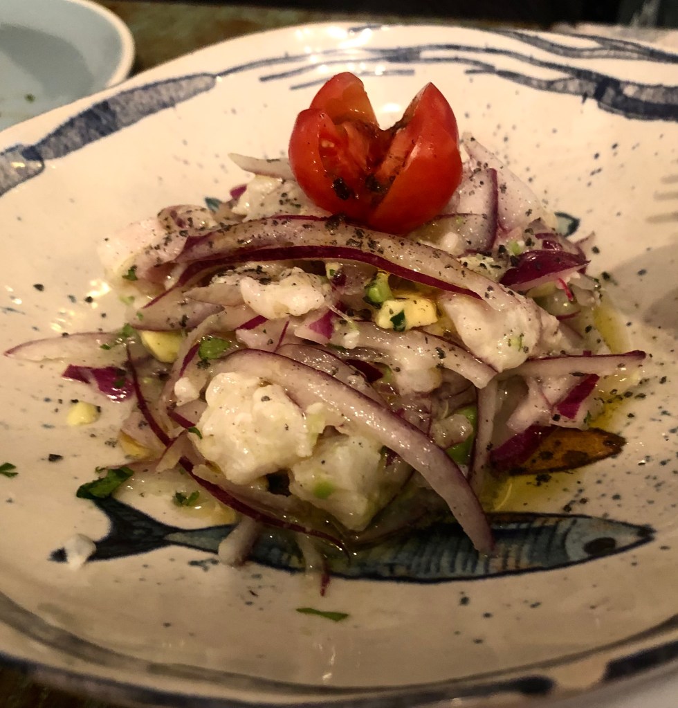 En muy buen lugar queda su Ceviche de corvina marinado con lima, cebolla roja, aguacate y cilantro buen punto y aliño correcto.
