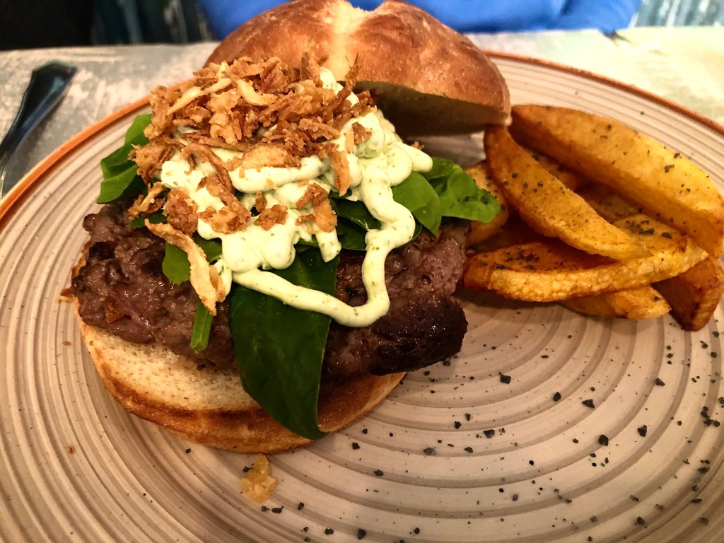 Y para los amantes de la carne y en particular de las hamburguesas, tienen varias. Está estuvo extraordinaria. Hamburguesa «La Nena». Carne de buey con sorpresa de queso ahumado, espinacas, mahonesa de albahaca y cebolla crujiente.