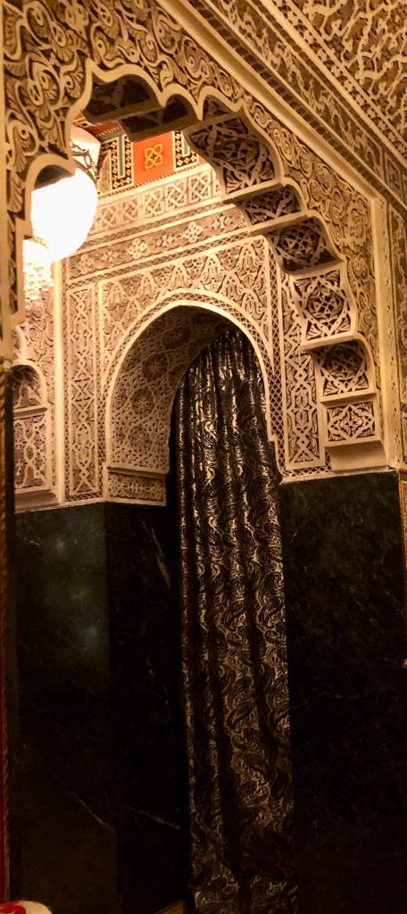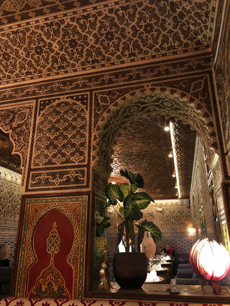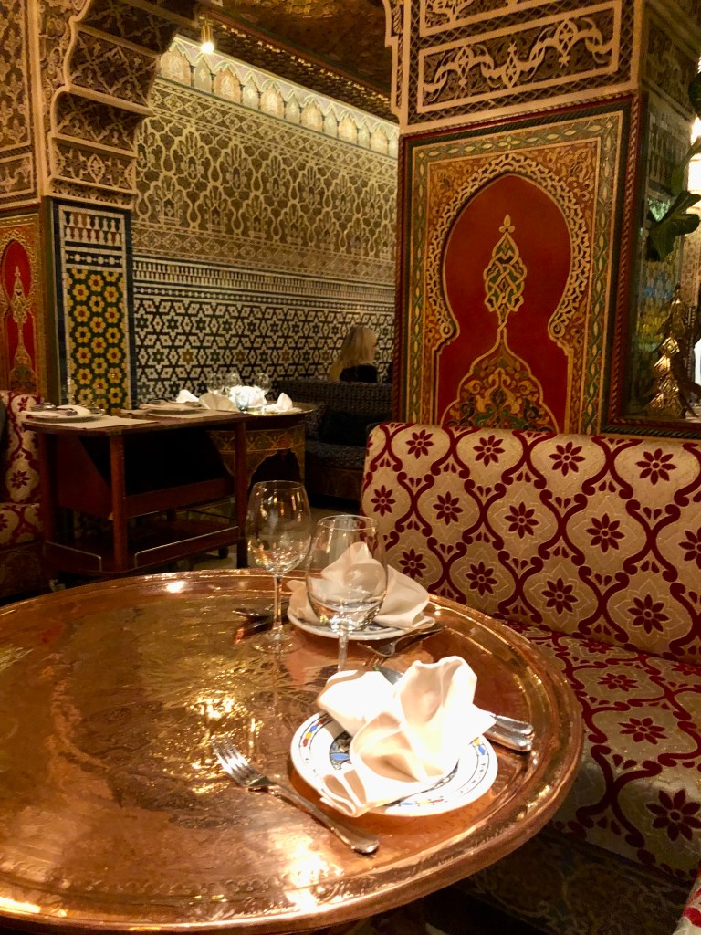 Conocí este restaurante a finales de los años 80 y me deslumbró. Su decoración es absolutamente fantástica, te transporta a un palacio marroquí, no en vano, la obra duró tres años hasta su apertura en 1966.