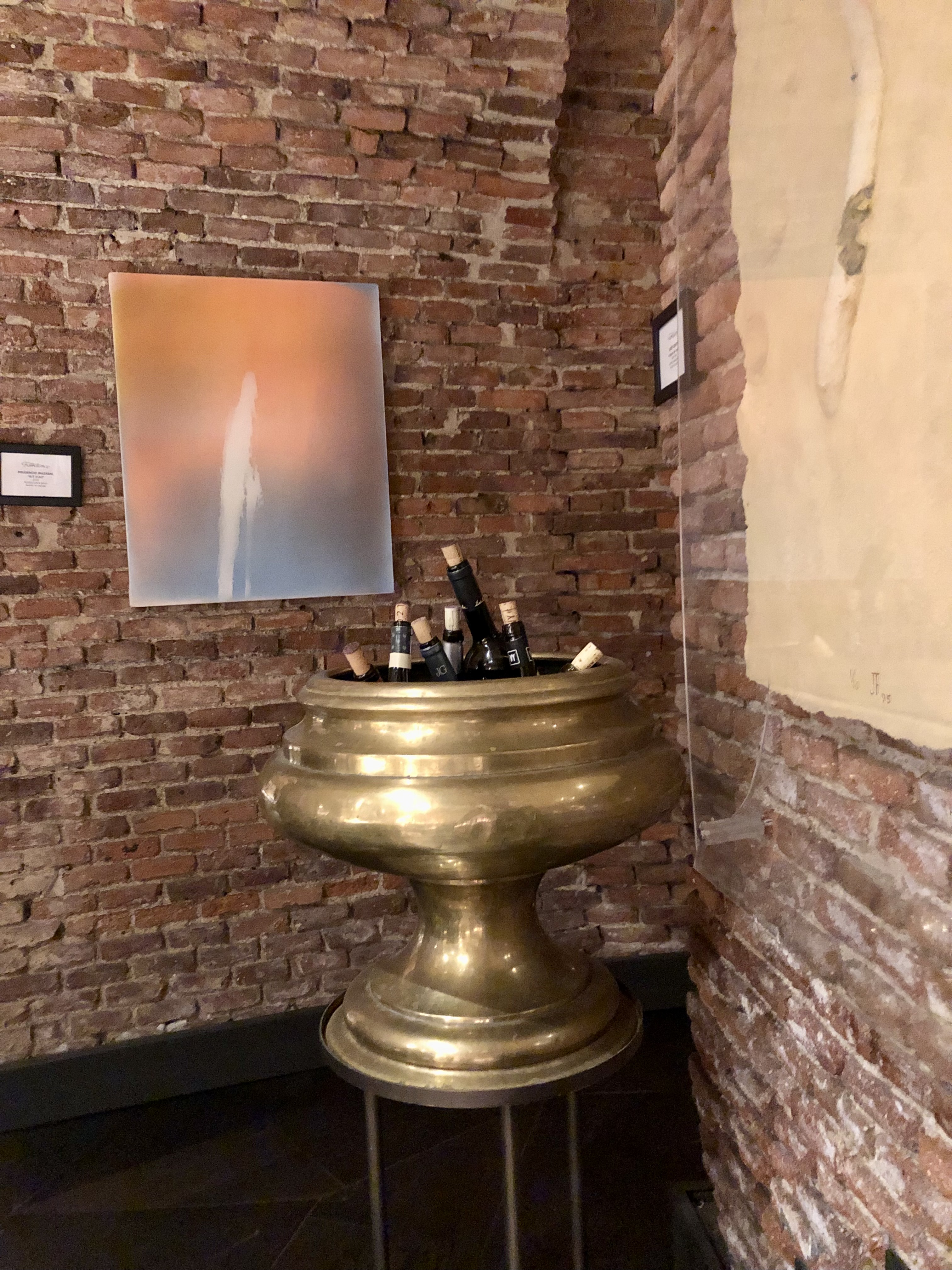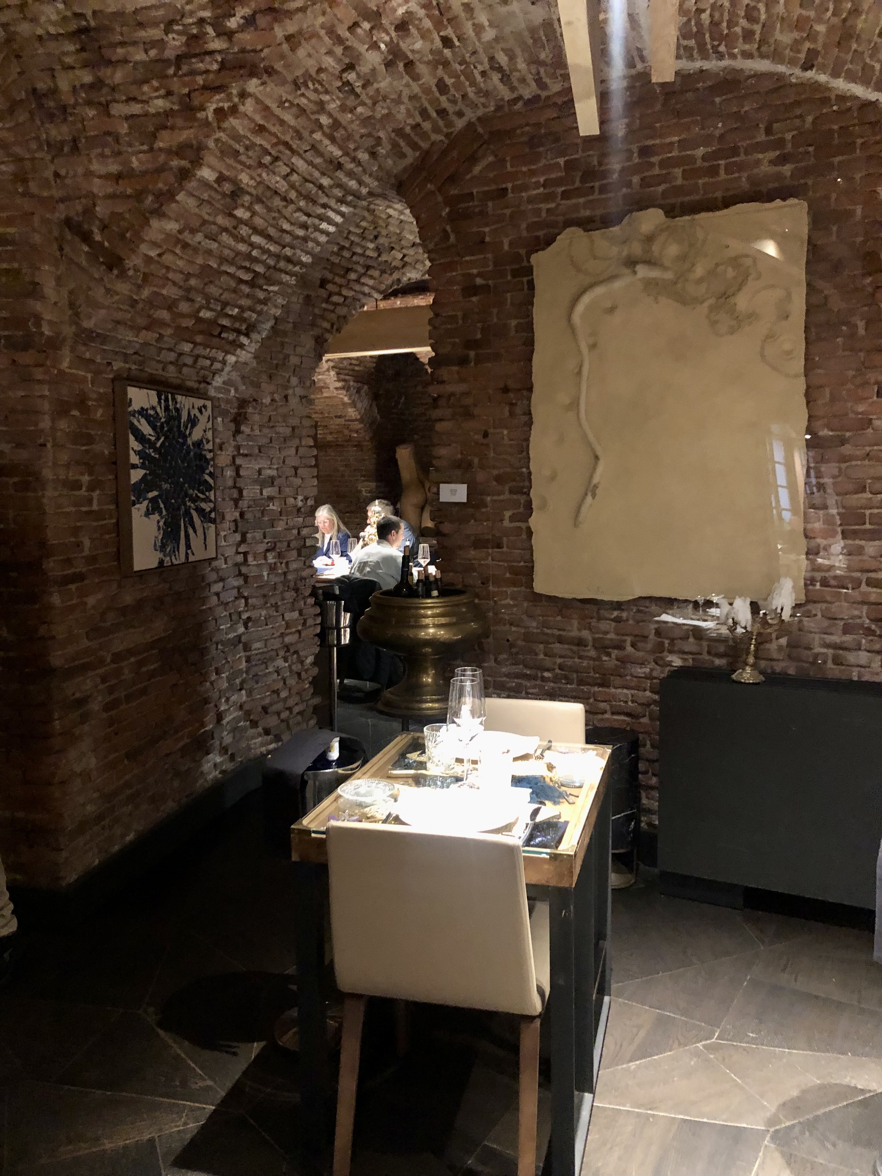 Debajo en el sótano es donde ya acabas de alucinar. Una estructura abovedada de ladrillo visto con cinco salas sabiamente divididas por mesas de distinta ocupación, de forma que no es lo mismo si vas en pareja, con amigos, etc. Creando ambientes diferentes dentro del mismo espacio.