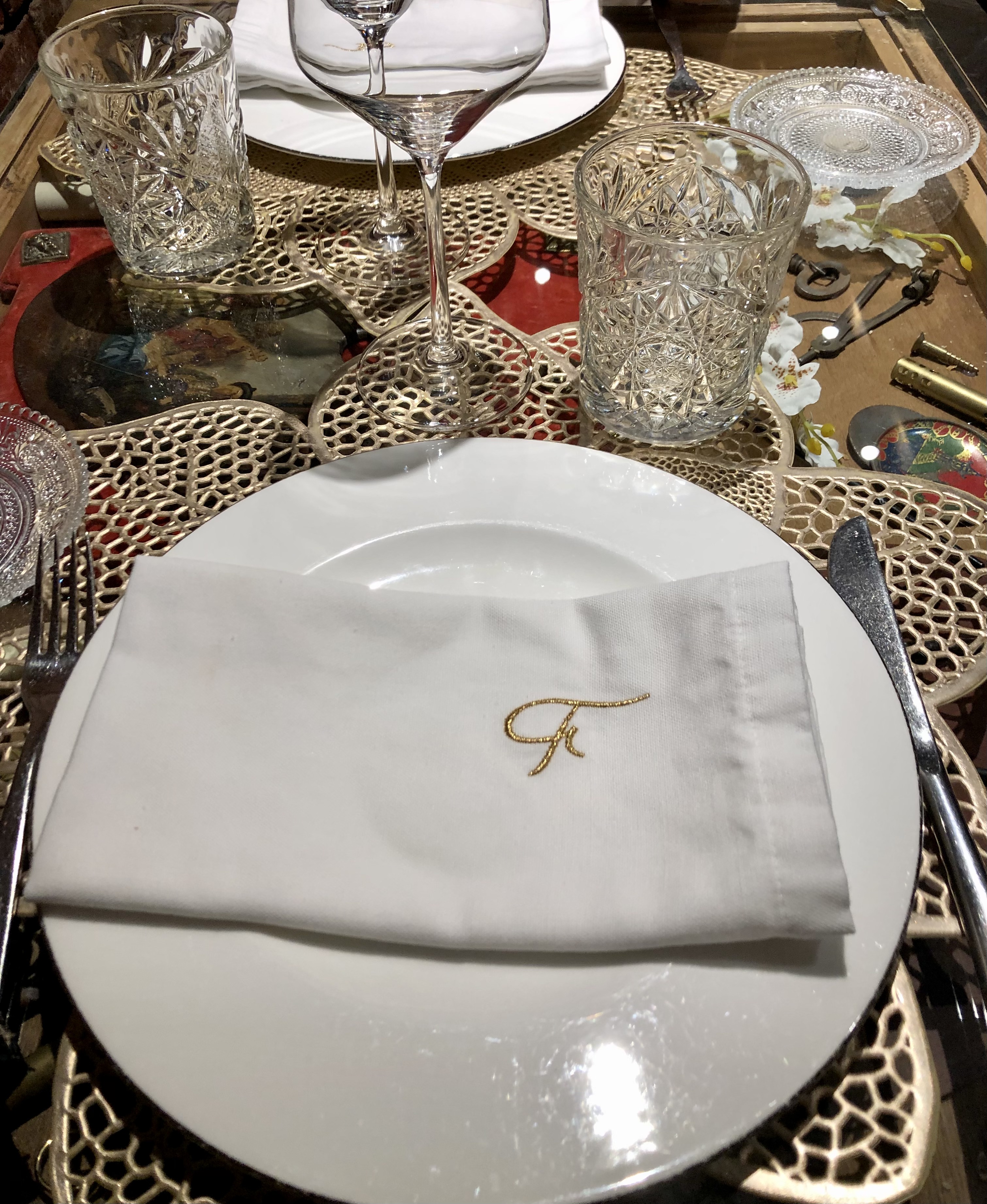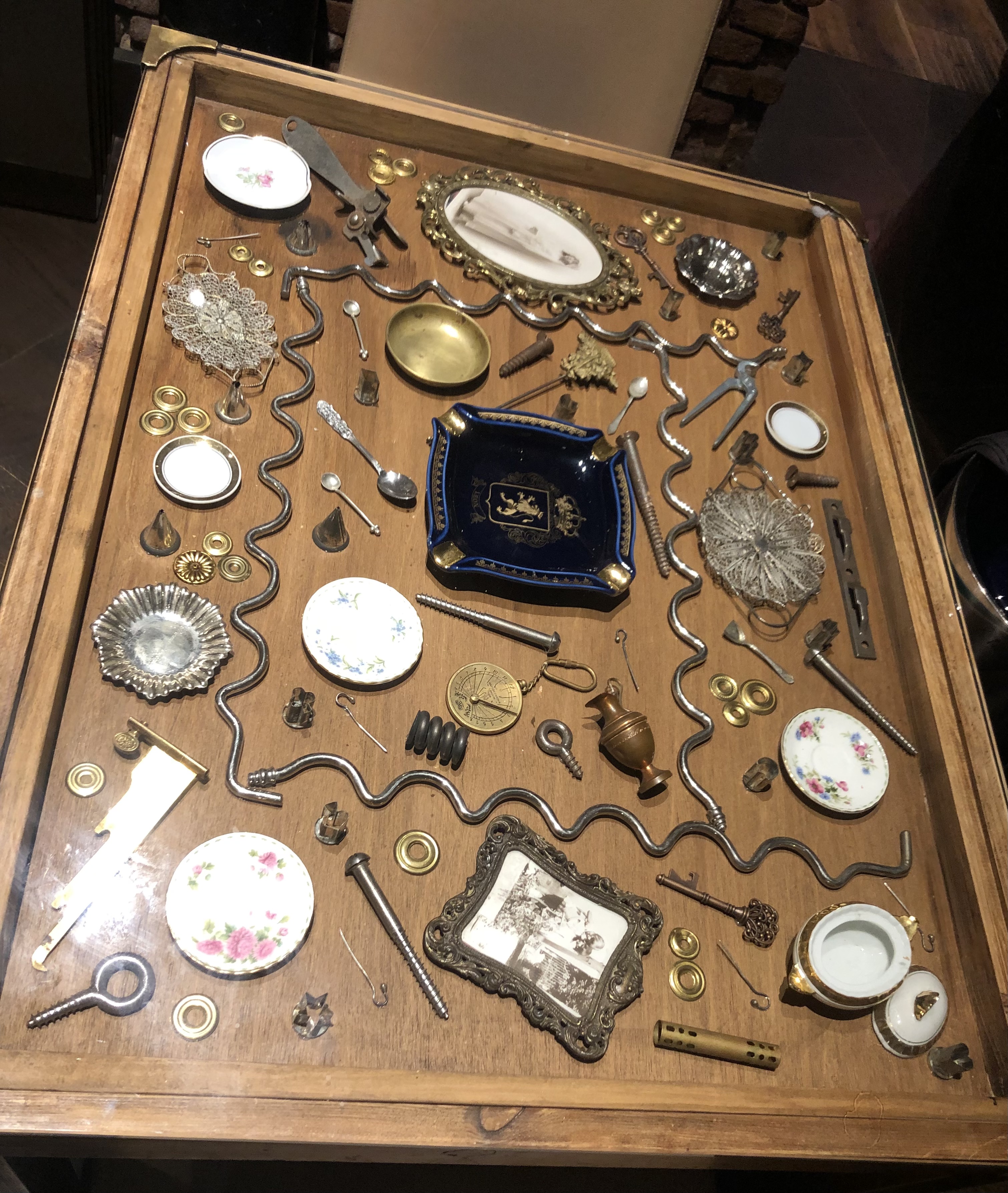 Y a esto le unimos las originales mesas cuya tapa de cristal esconde multitud de objetos de todo tipo, pequeños tornillos, marcos de fotos, ceniceros antiguos, arandelas, muelles, alcayatas un sinfín de piezas originales. Bonitos salvamanteles, vajilla y cristalería completan un conjunto que te recibe antes de leer la carta.