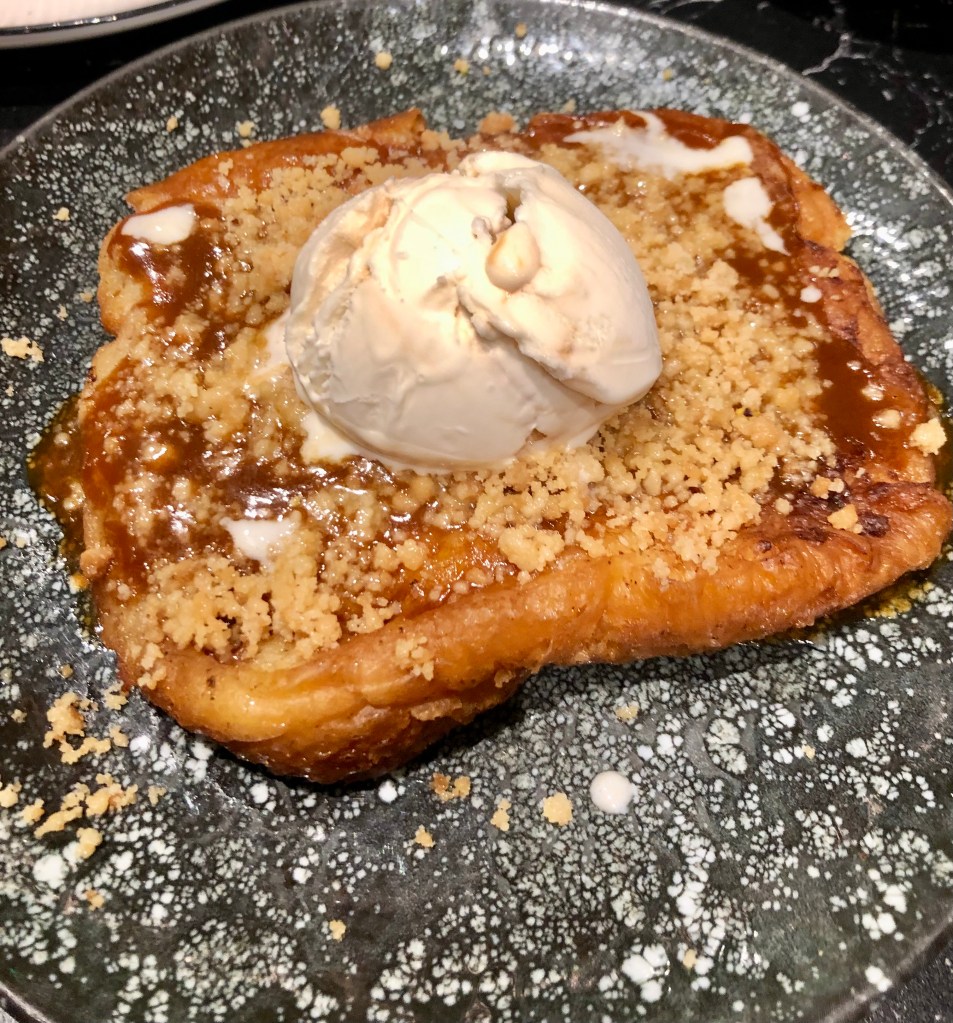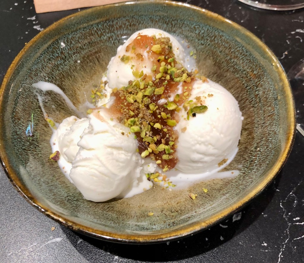 Recomendable la típica Torrija con helado propia ya de las fechas que se avecina, y uno muy refrescante, El helado de Yogur con confitura de higo al oporto y pipas de calabaza