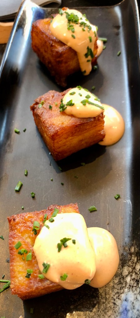 Su nueva versión de las patatas bravas, milhojas con mayonesa de chipotles ahumados, o Los puerros con yogurt, parmesano y kikos
