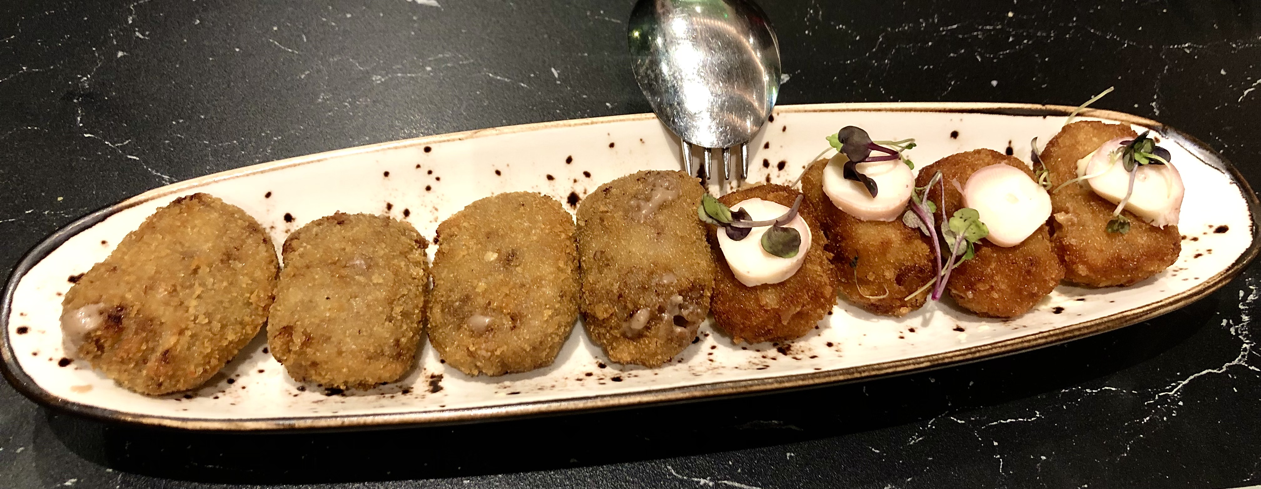 Especiales como sus jugosas Croquetas de Txuleta, Pulpo, boletus y trufa o sus originales Tortillitas de camarones, con gambón al curry rojo, deliciosas
