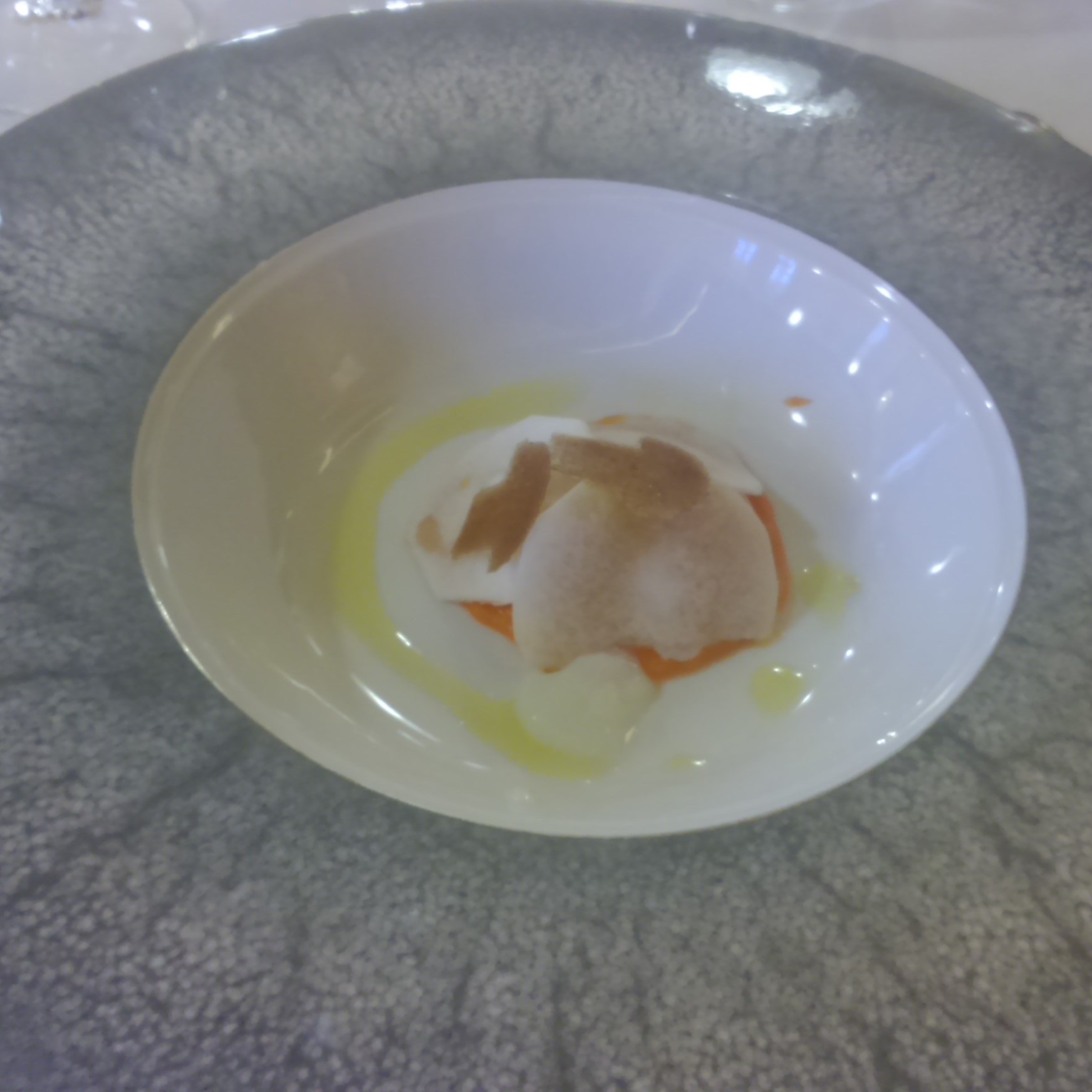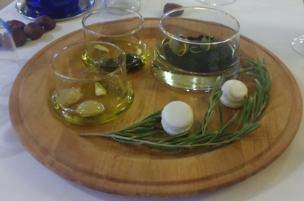 Mientras que eliges en carta el menú, te reciben con una cata de aceites de la zona, acompañados de longaniza de Graus presentada en una lata y pan. La verdad es que es algo que me sorprendió gratamente, no conocía la calidad extraordinaria y variedad de los aceites del Somontano.