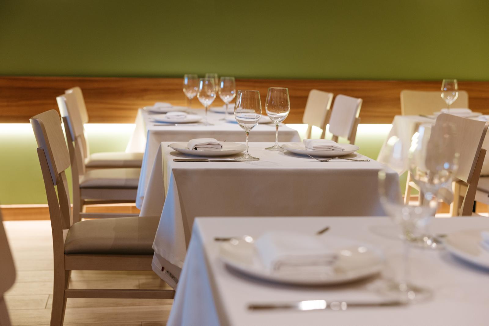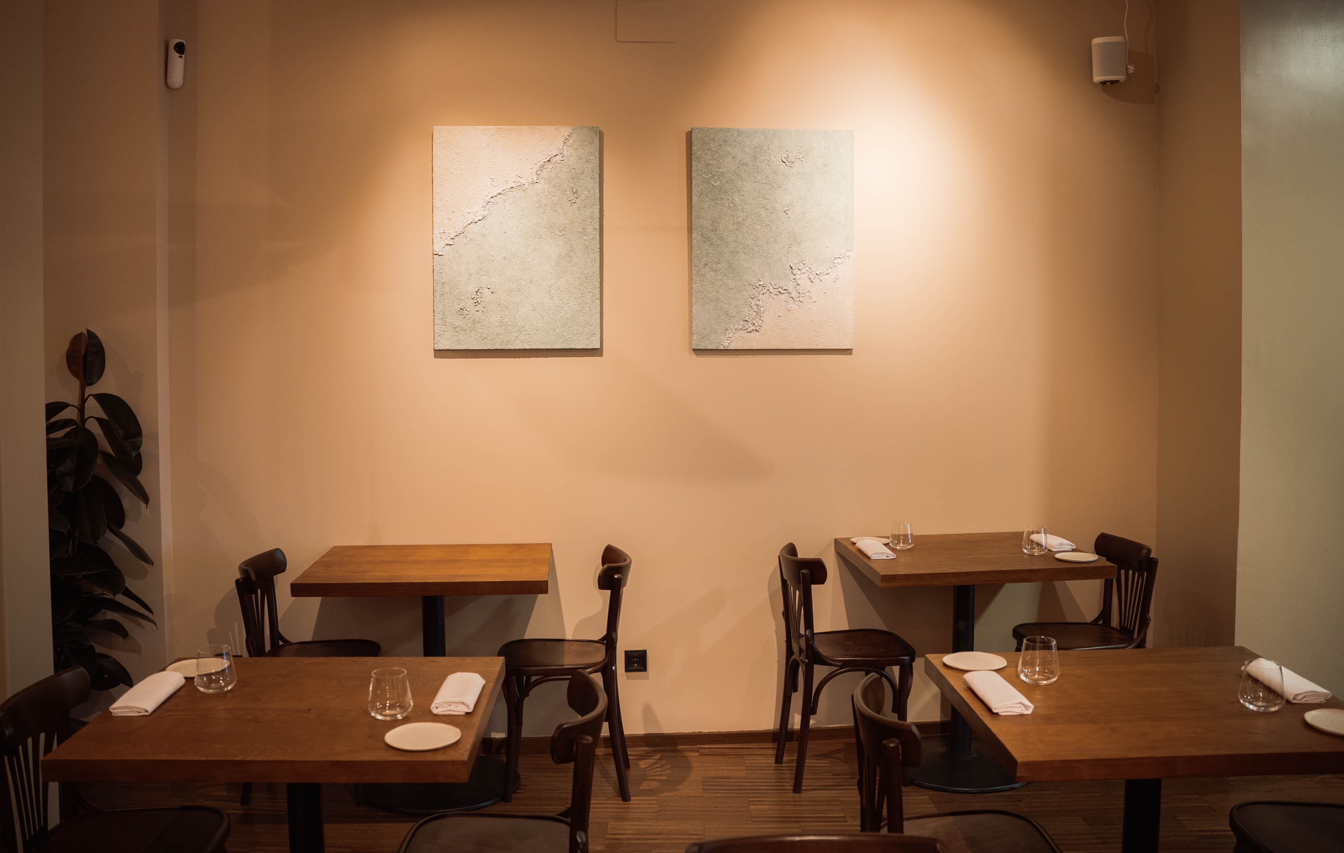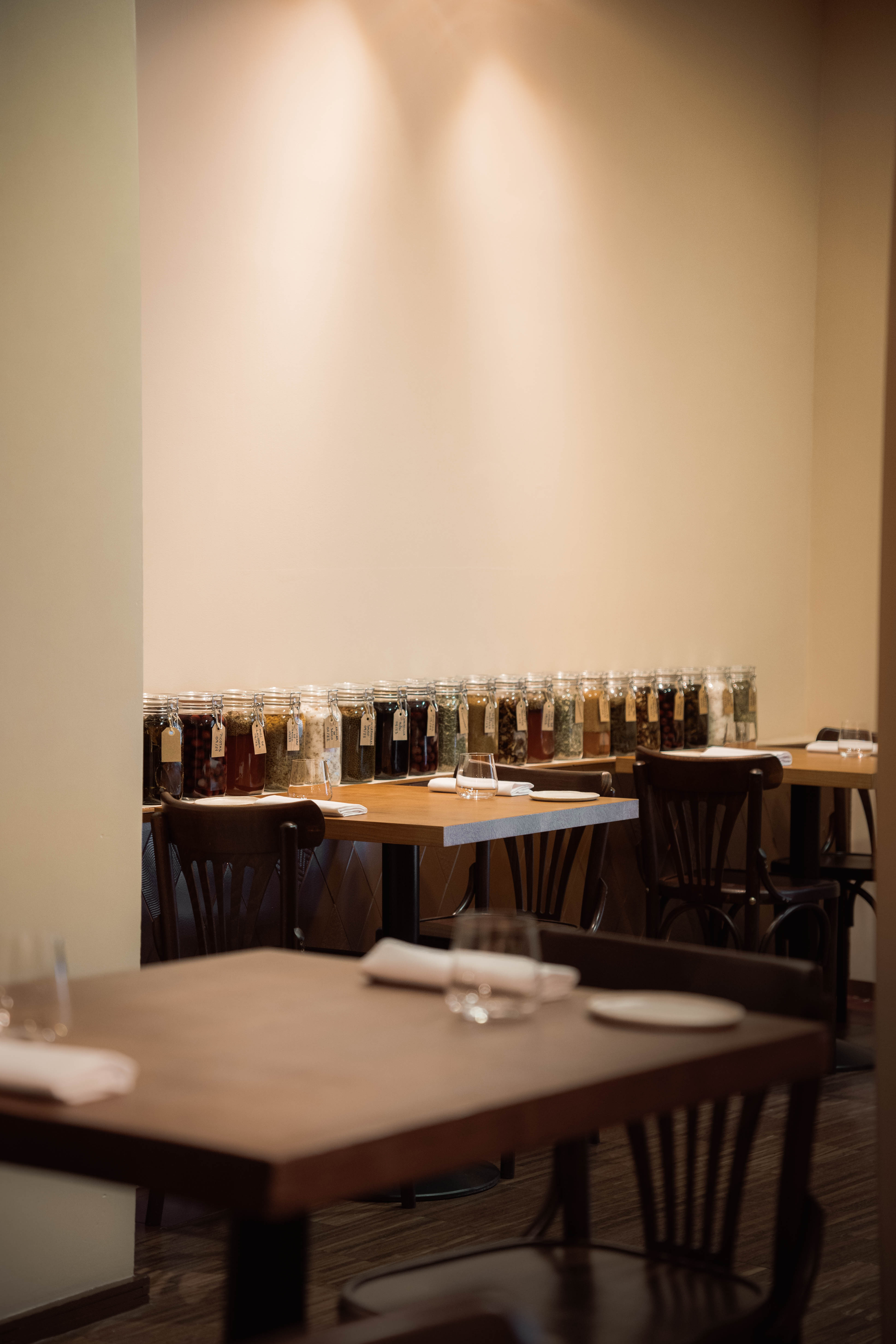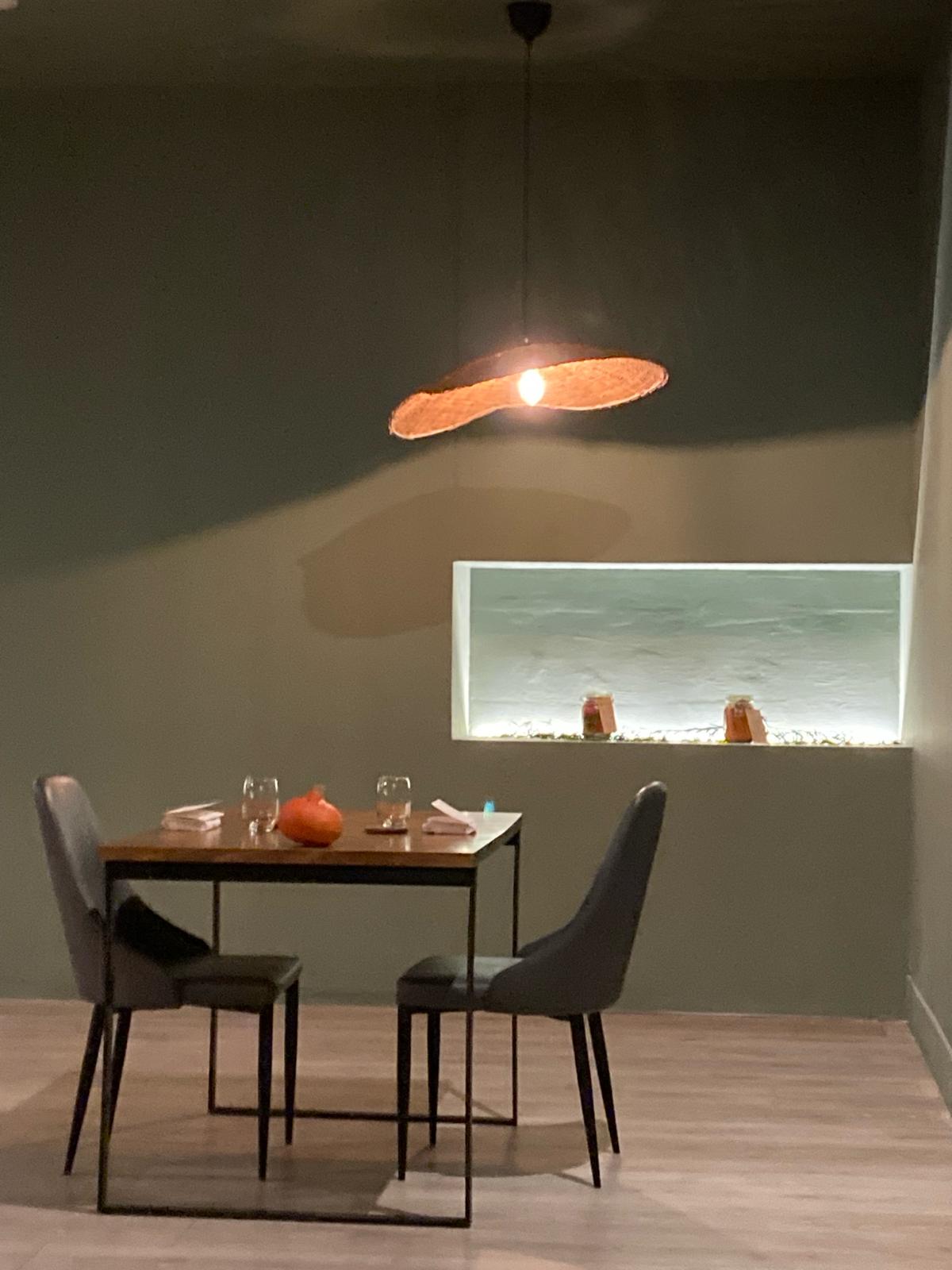 Mesas desnudas, separadas, tono gris verdoso en la pared, lámparas de fibras naturales en el techo y el detalle de unos botes de conservas en una estantería horadada en el muro.