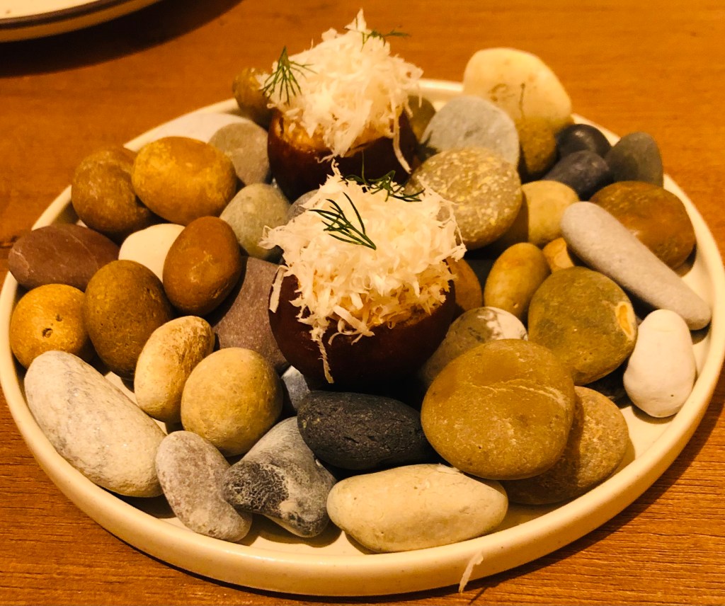 En una original base con piedras un rabanito picante relleno resulta una tarjeta de presentación de lo que va a ser el resto.