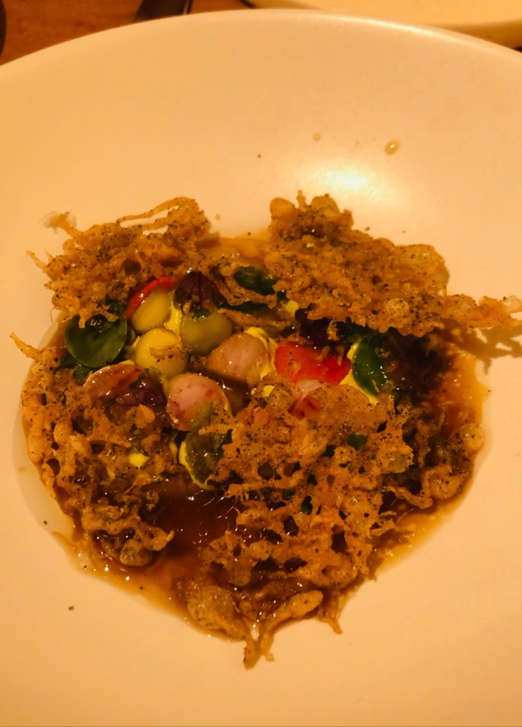 Lubina encurtida con un marinado muy especial, vinagreta de ponzu y jalapeño con mayonesa de eneldo yscraps, un homenaje al famoso Fish and chips, que según cuenta Patricia, cuando en Inglaterra preparan el pescado, la masa que lo cubre se va soltando en el aceite al freírlo, eso se retira y se sirve aparte, aquí lo hacen en forma de una tortita por encima, que le aporta ese crujiente tan especial. Impresionante!!, todo sabor.