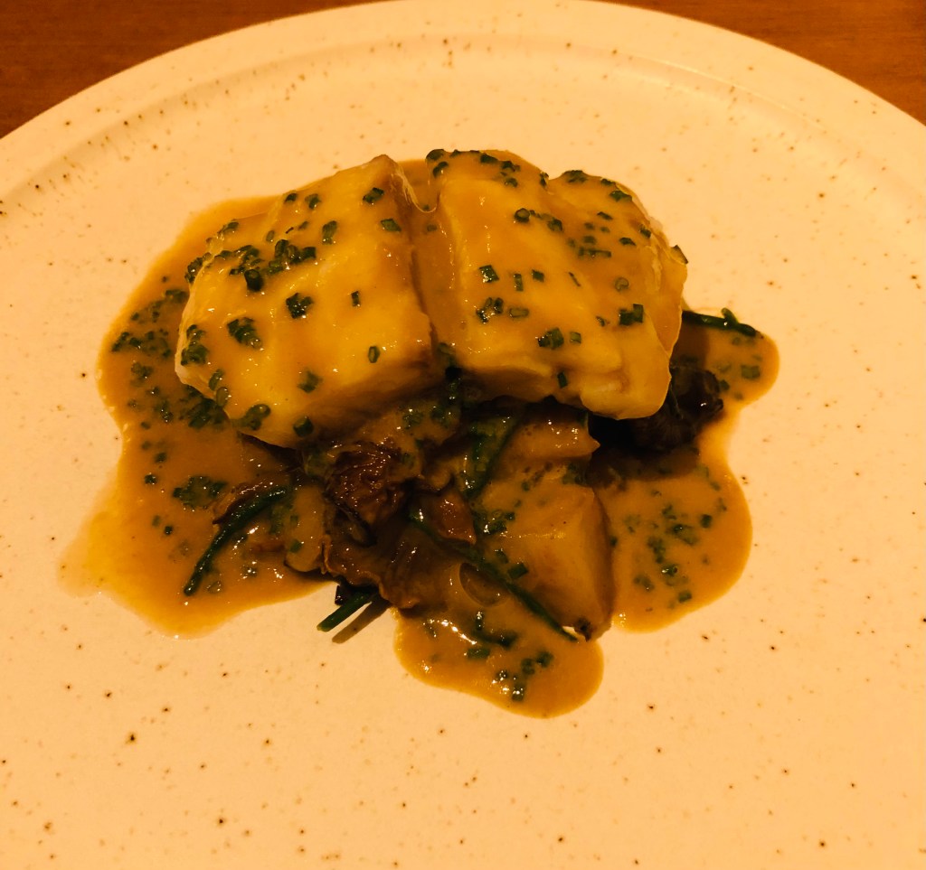 También probamos un Bacalao confitado a baja temperatura sobre crema de patata y ajetes crujientes