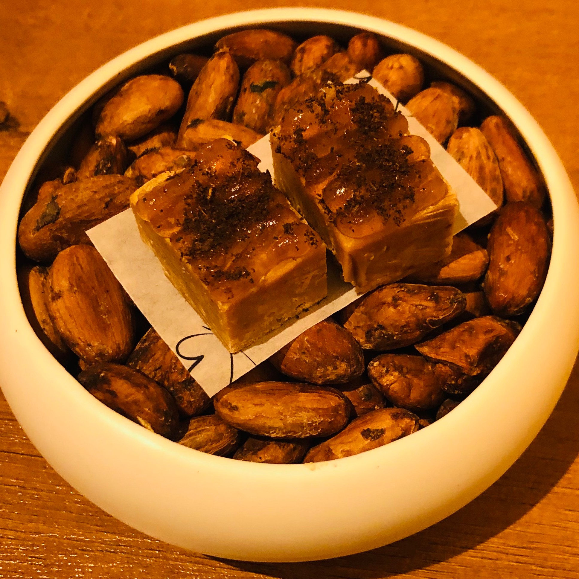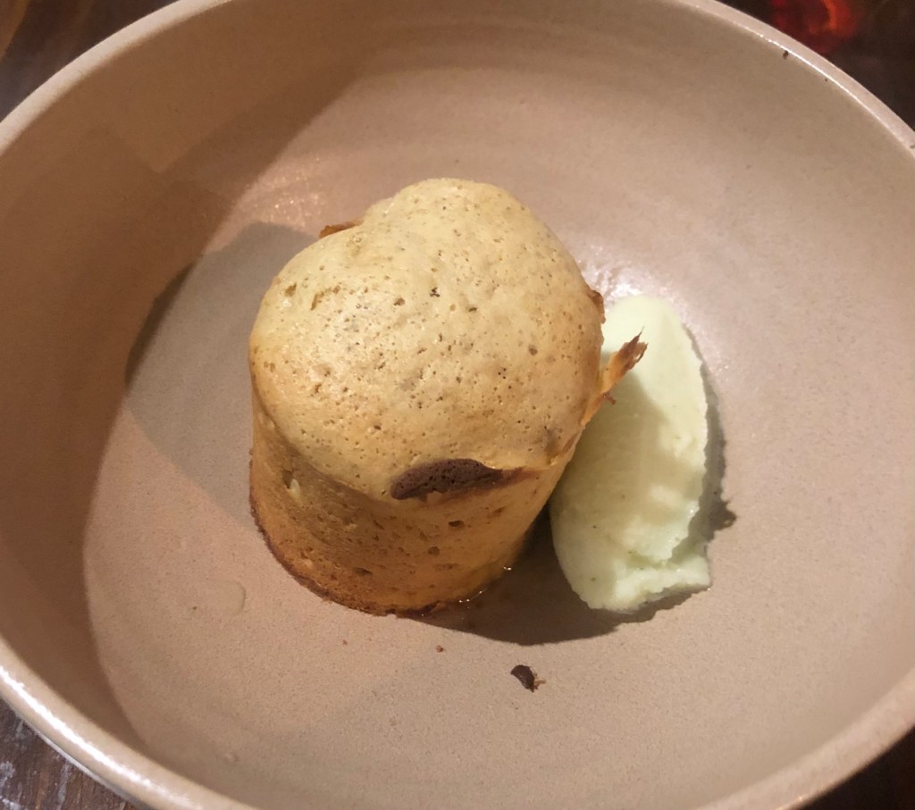 Muy original el Coulant de avellanas tostadas, albahaca y miel fermentada.