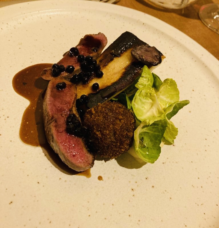 Además de fortalecer el sistema inmunitario, las bayas de sauco tienen múltiples propiedades, su sabor es similar al de los arándanos con algunas notas de frambuesa, estas junto con la chirivía, que aporta un toque anisado y un ligero matiz picante, son el acompañamiento perfecto a este plato tan bien elaborado, al que acompañan con una pequeña albóndiga hecha con los entresijos del pichón.