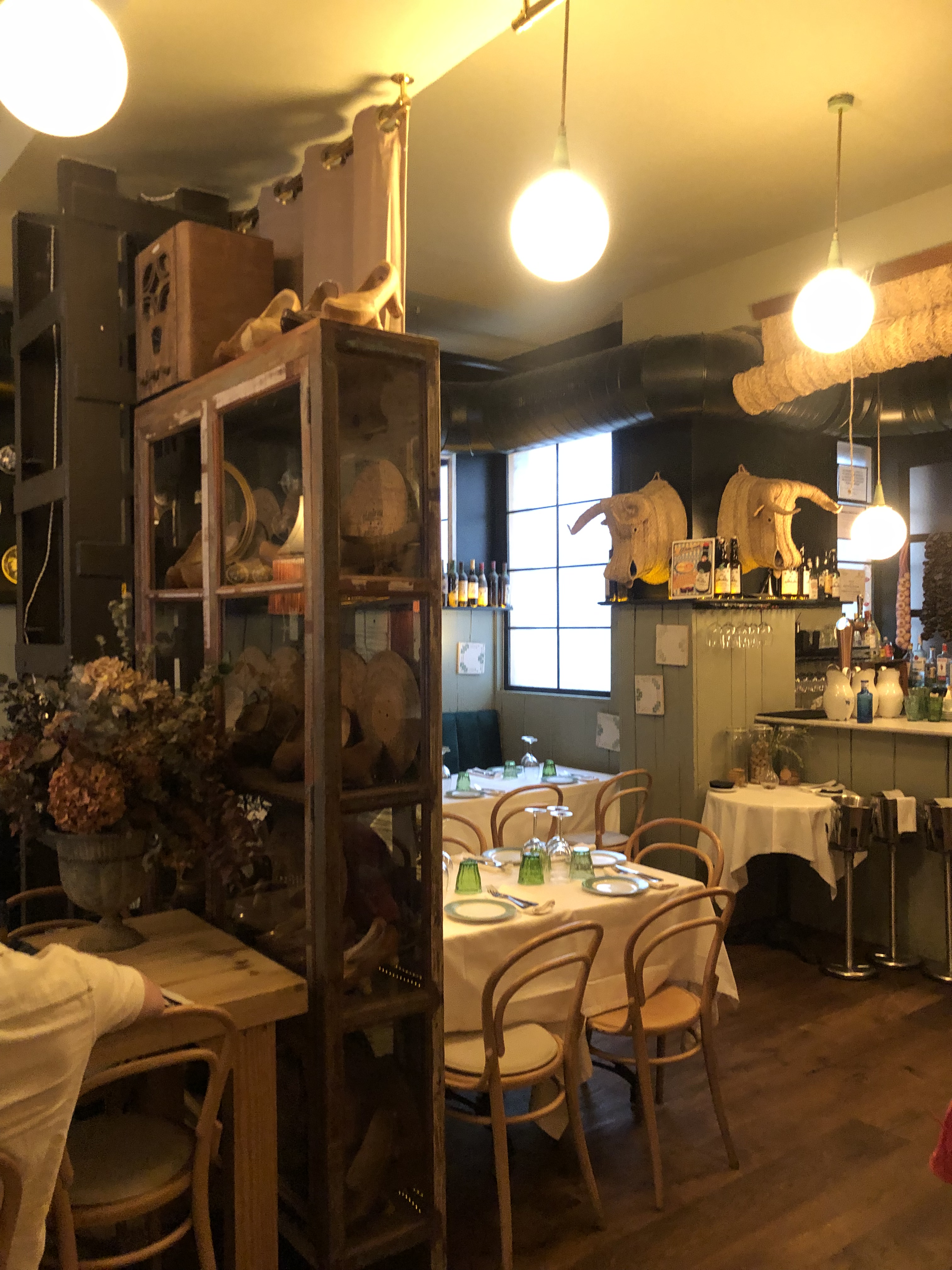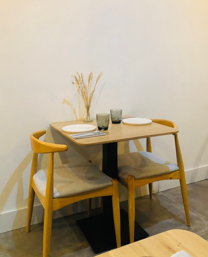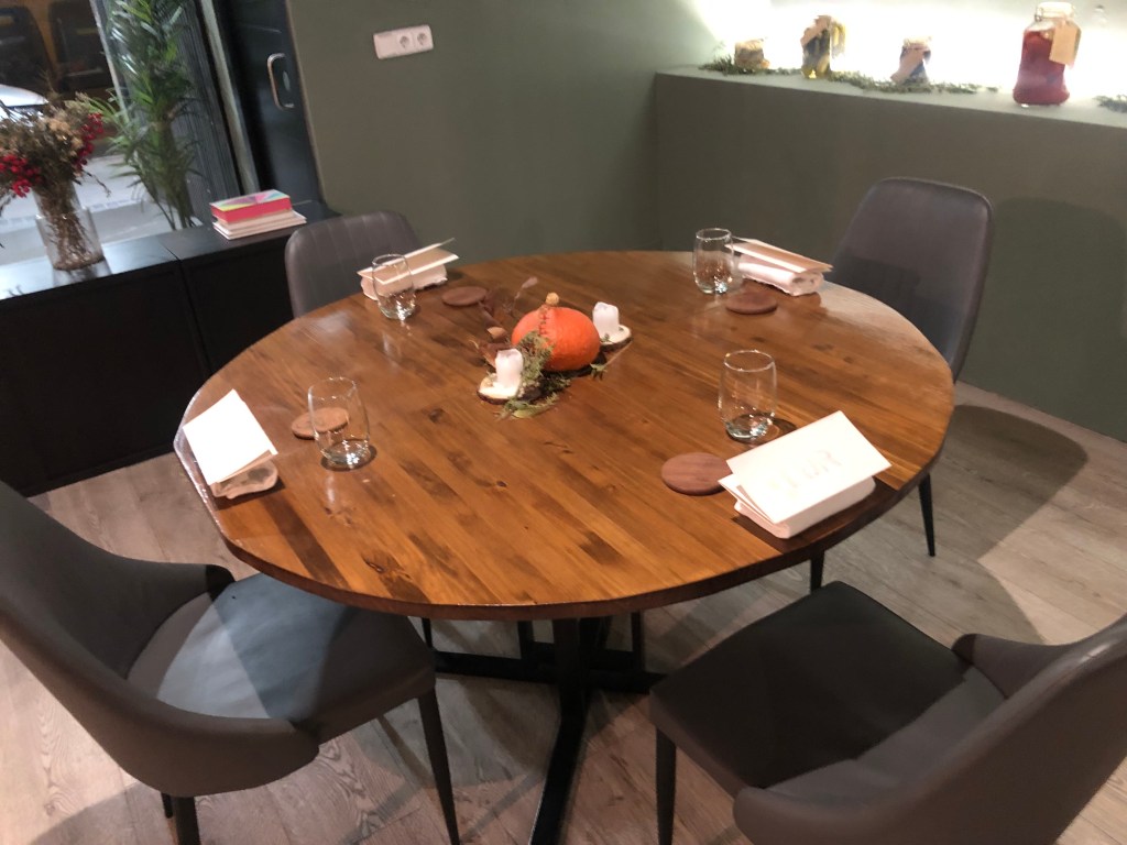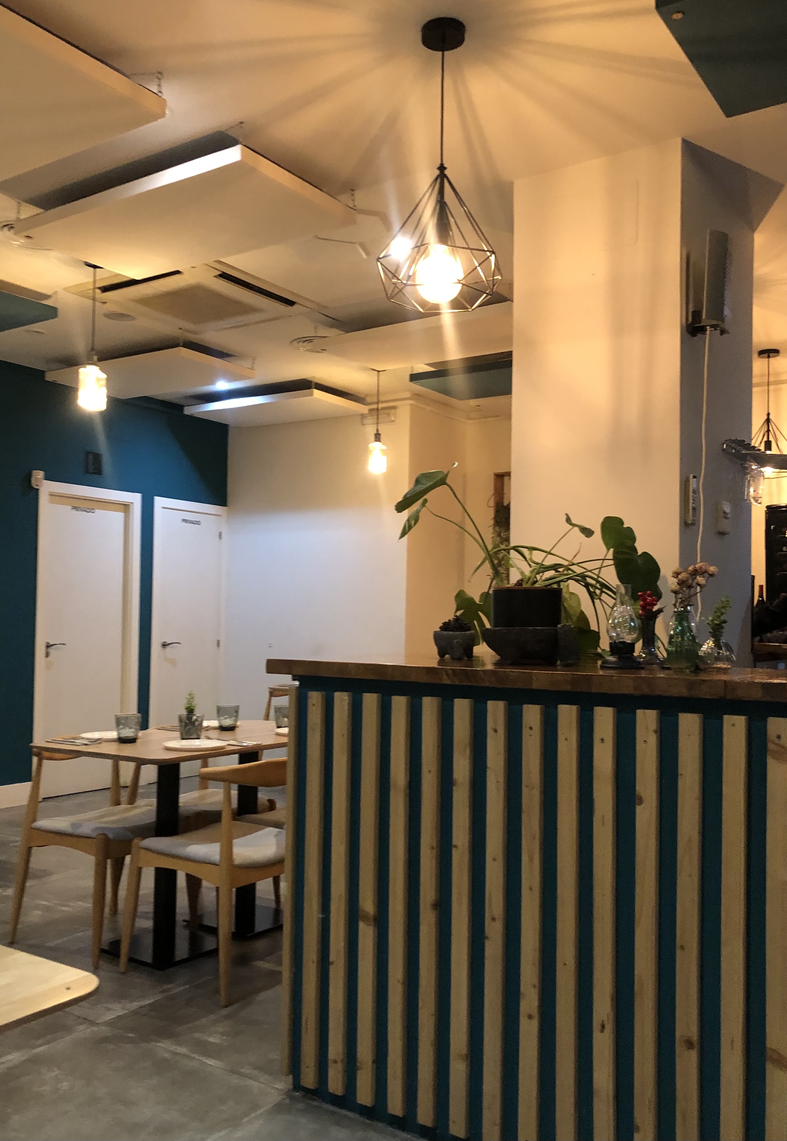 El restaurante para mi gusto tiene el tamaño justo para este tipo de propuesta. Una decena de mesas de madera desnuda, en el estilo que hoy se lleva. Minimalista en decoración con un tono de pared que le da un toque más cálido, y tan solo algún cuadro o el original detalle de una estantería llena de botes con encurtidos, especias…rompen esa esencialidad.
