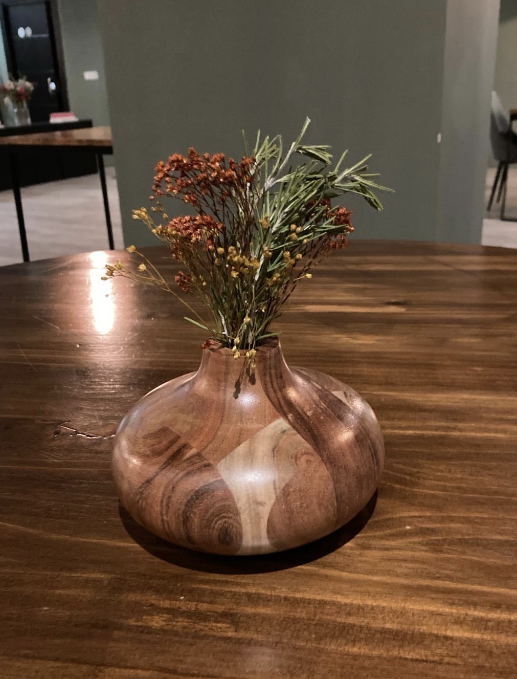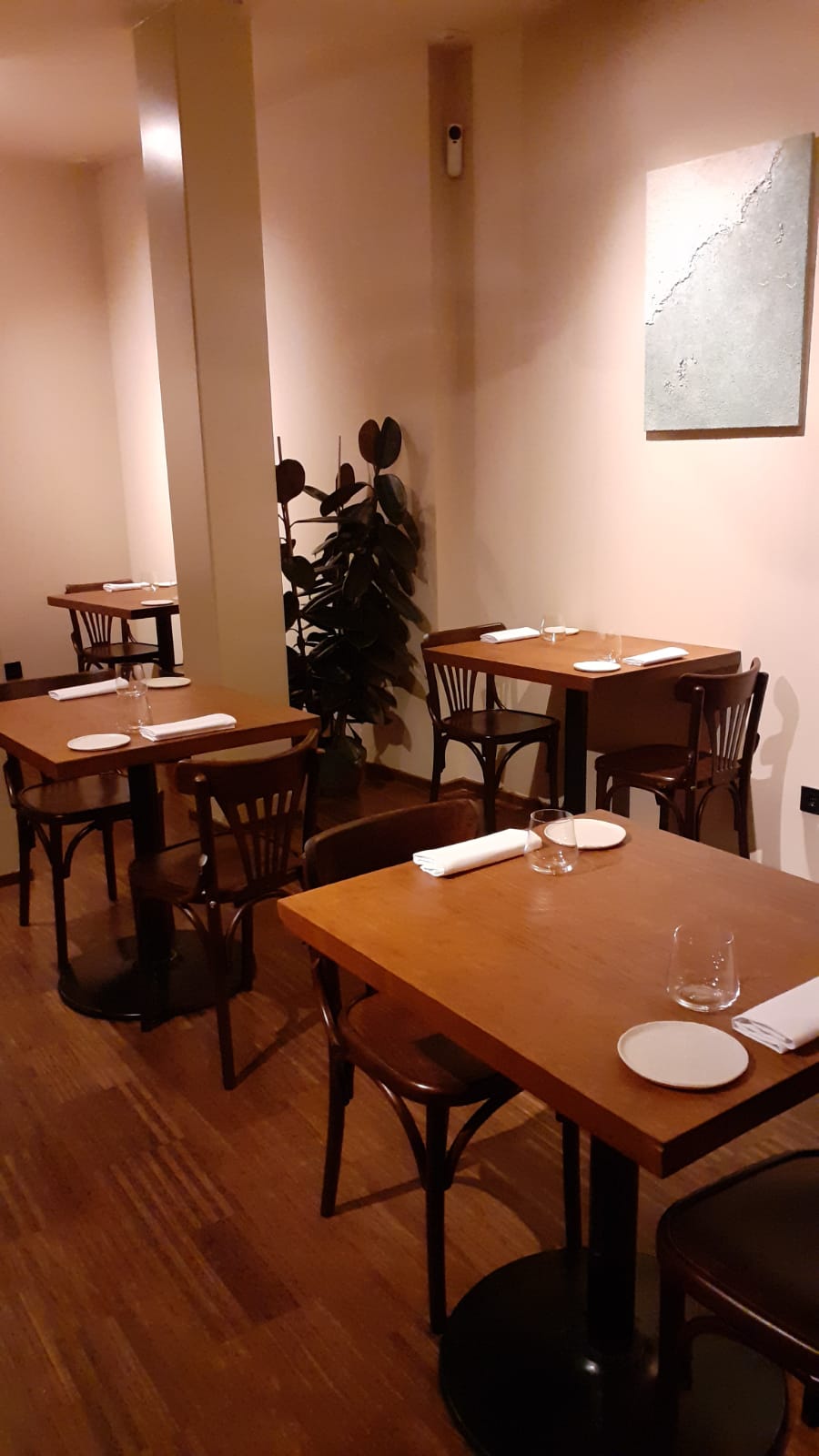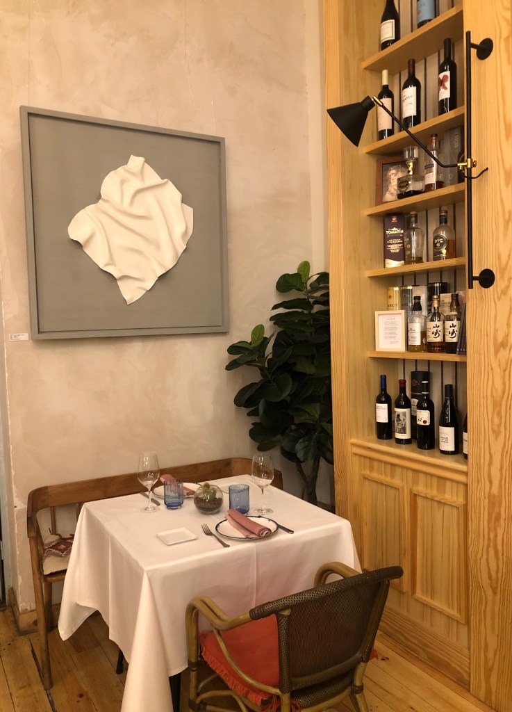 El restaurante para mi gusto tiene el tamaño justo para este tipo de propuesta. Una decena de mesas de madera desnuda, en el estilo que hoy se lleva. Minimalista en decoración con un tono de pared que le da un toque más cálido, y tan solo algún cuadro o el original detalle de una estantería llena de botes con encurtidos, especias…rompen esa esencialidad.