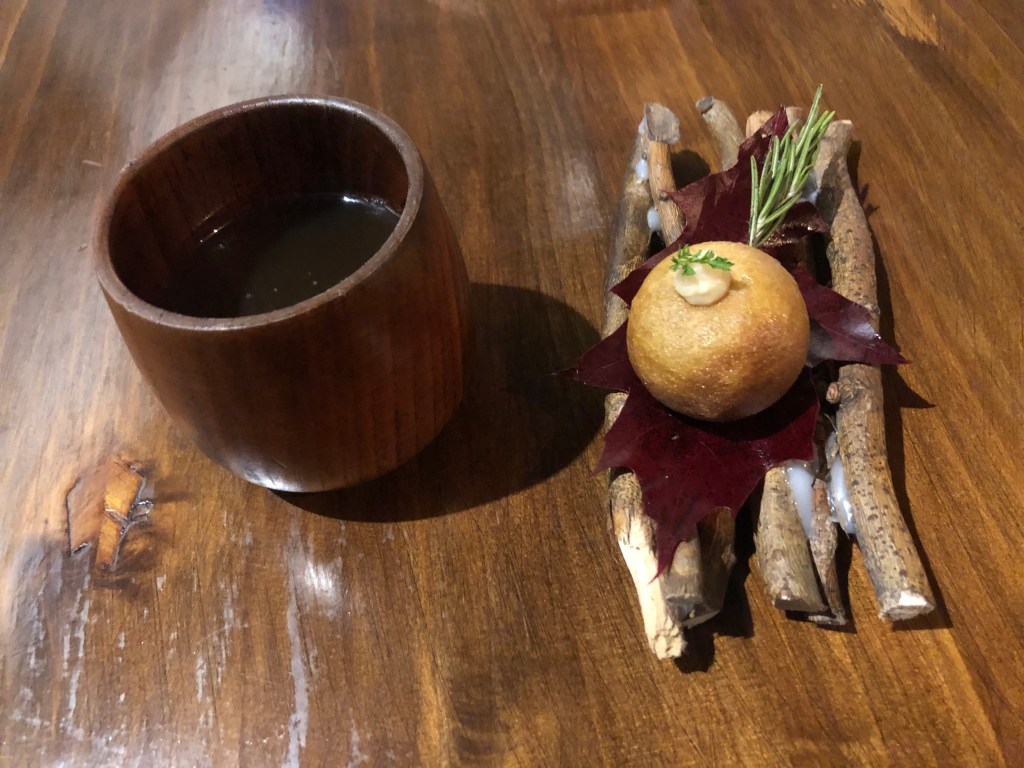 Da comienzo la experiencia con un aperitivo, un rico buñuelo de perdiz y un increíble caldo de verduras con un toque de trufa. ¡Ojo a las verduras en este sitio que auguro darán que hablar!