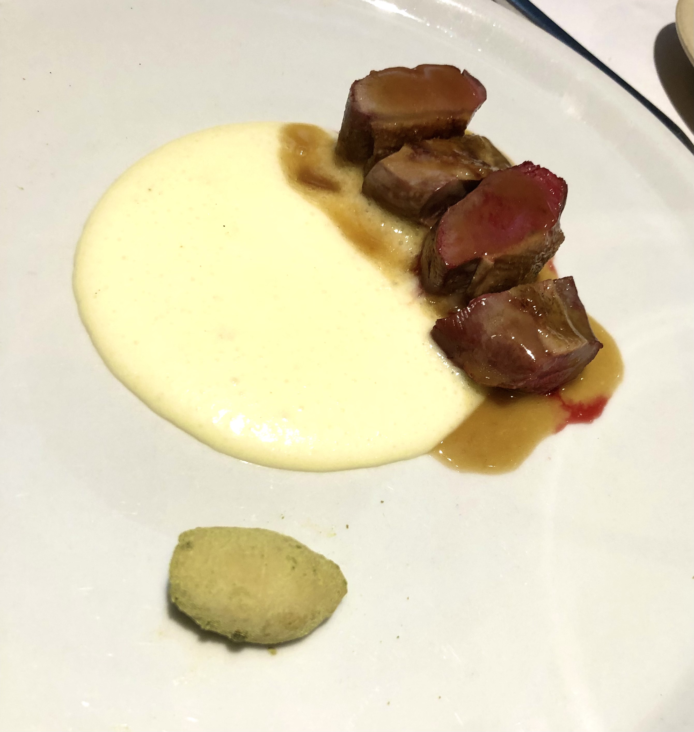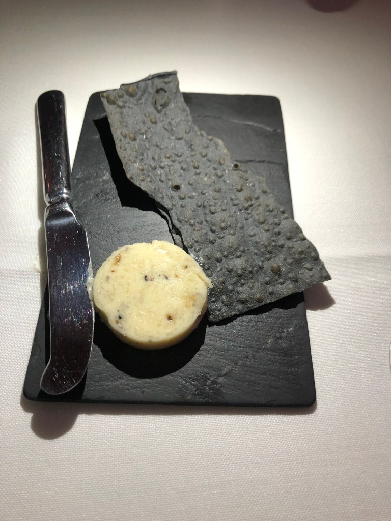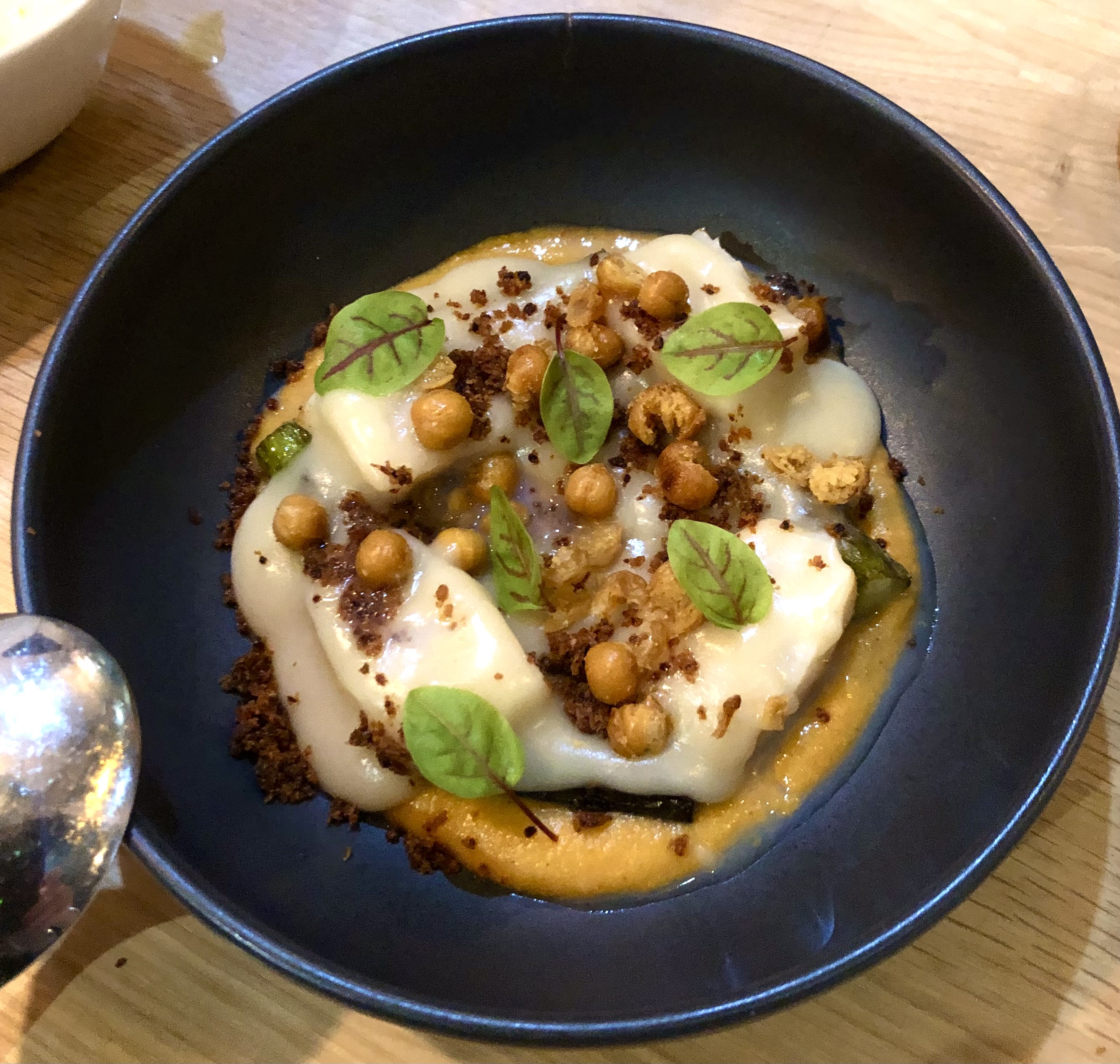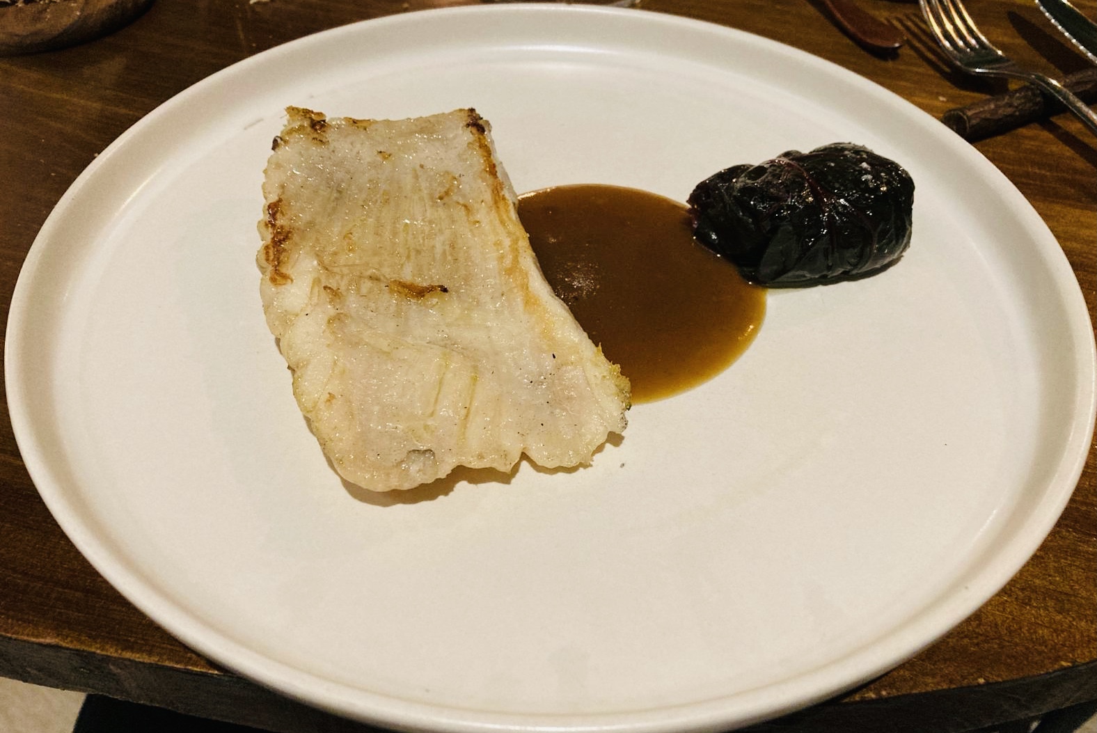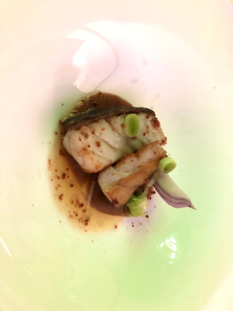 Una Aleta de raya, salsa untuosa de aceitunas de kalamata, canelón de lombarda semidulce y mantequilla de chufa. Un pescado bien tratado a la parrilla de carbón, y a destacar el delicioso canelón de lombarda. ¿Os he contado ya que las verduras aquí son un plus? Pues en cada plato cobran un especial protagonismo. Y, ¿Cómo no?, el detalle de la mantequilla de chufa, un guiño al origen valenciano de Sergio, el chef.