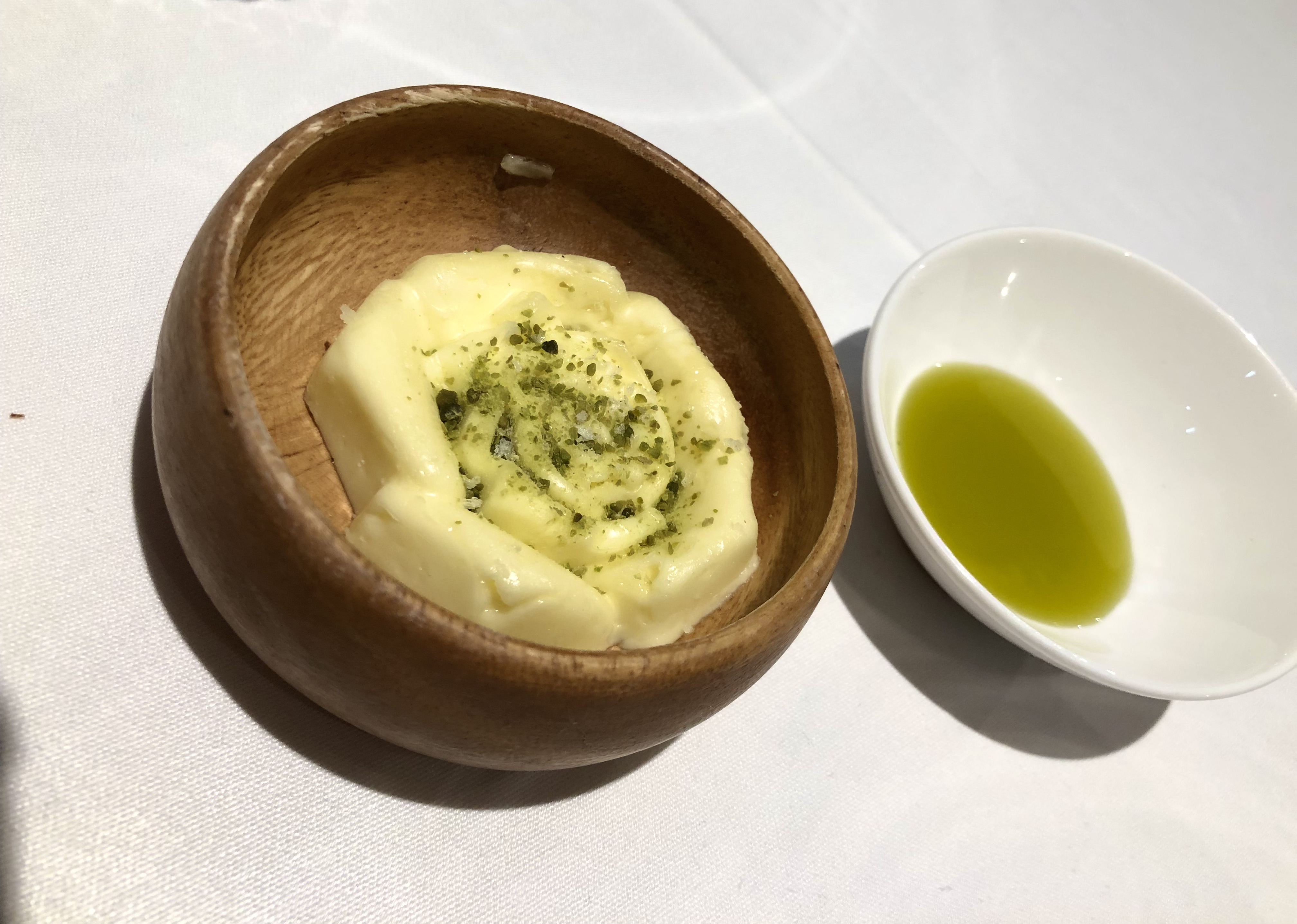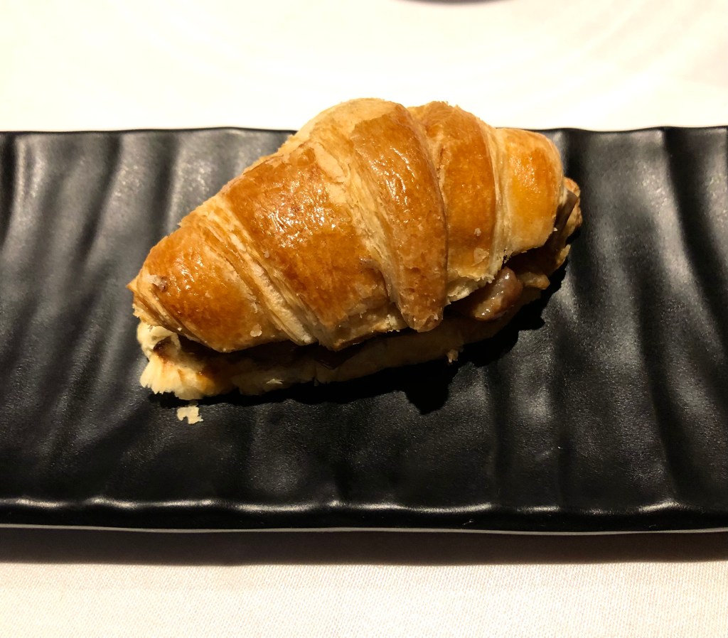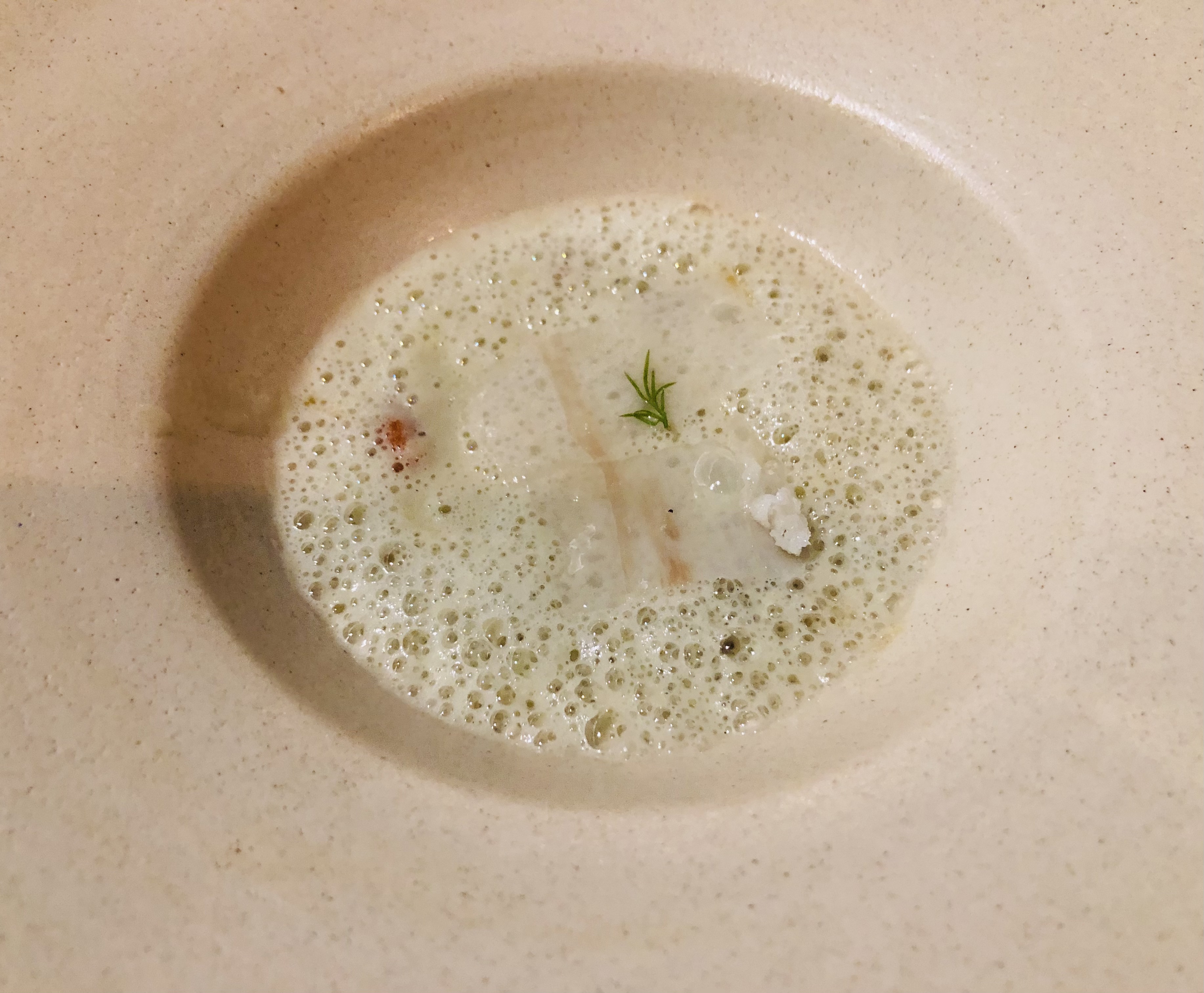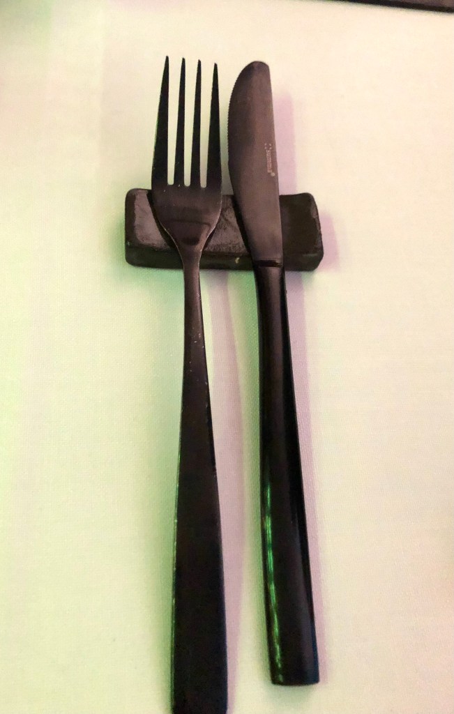 Una Aleta de raya, salsa untuosa de aceitunas de kalamata, canelón de lombarda semidulce y mantequilla de chufa. Un pescado bien tratado a la parrilla de carbón, y a destacar el delicioso canelón de lombarda. ¿Os he contado ya que las verduras aquí son un plus? Pues en cada plato cobran un especial protagonismo. Y, ¿Cómo no?, el detalle de la mantequilla de chufa, un guiño al origen valenciano de Sergio, el chef.