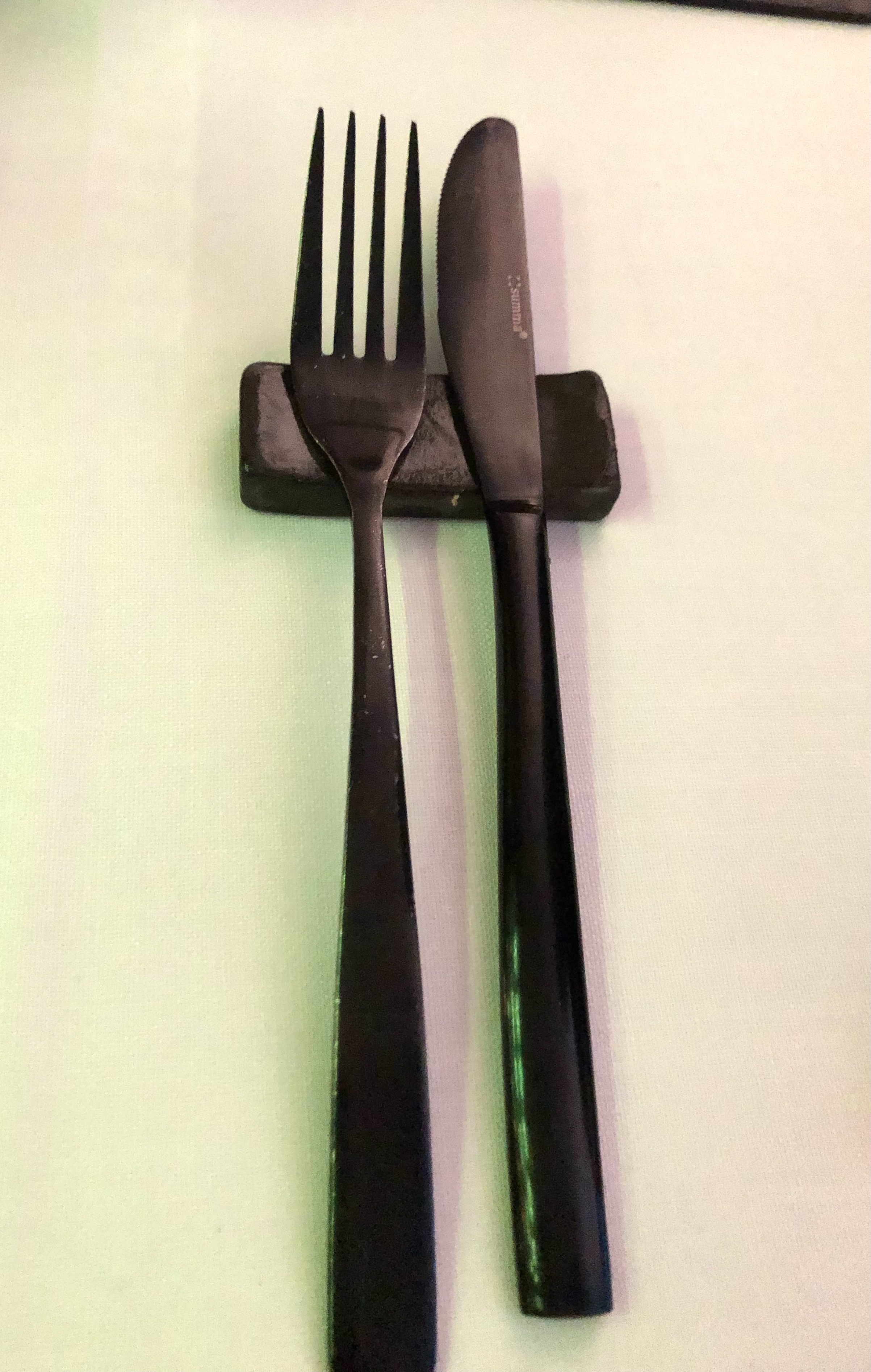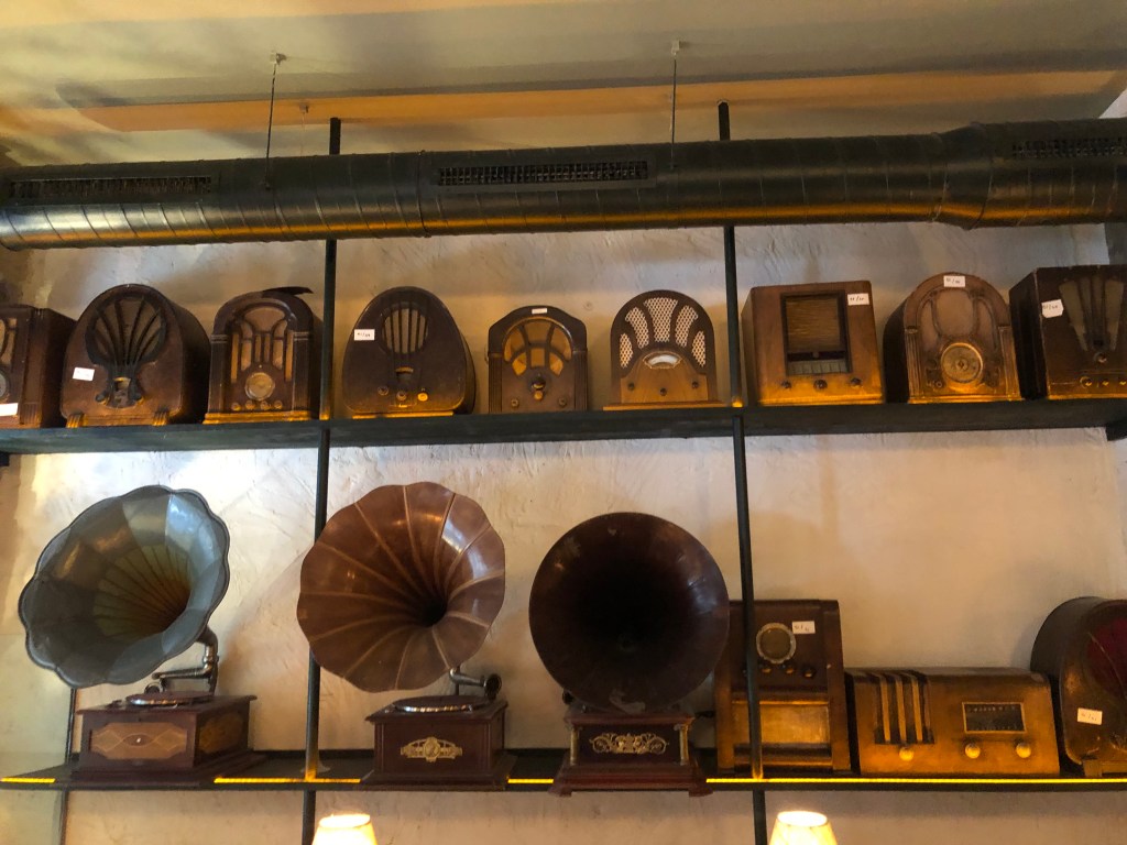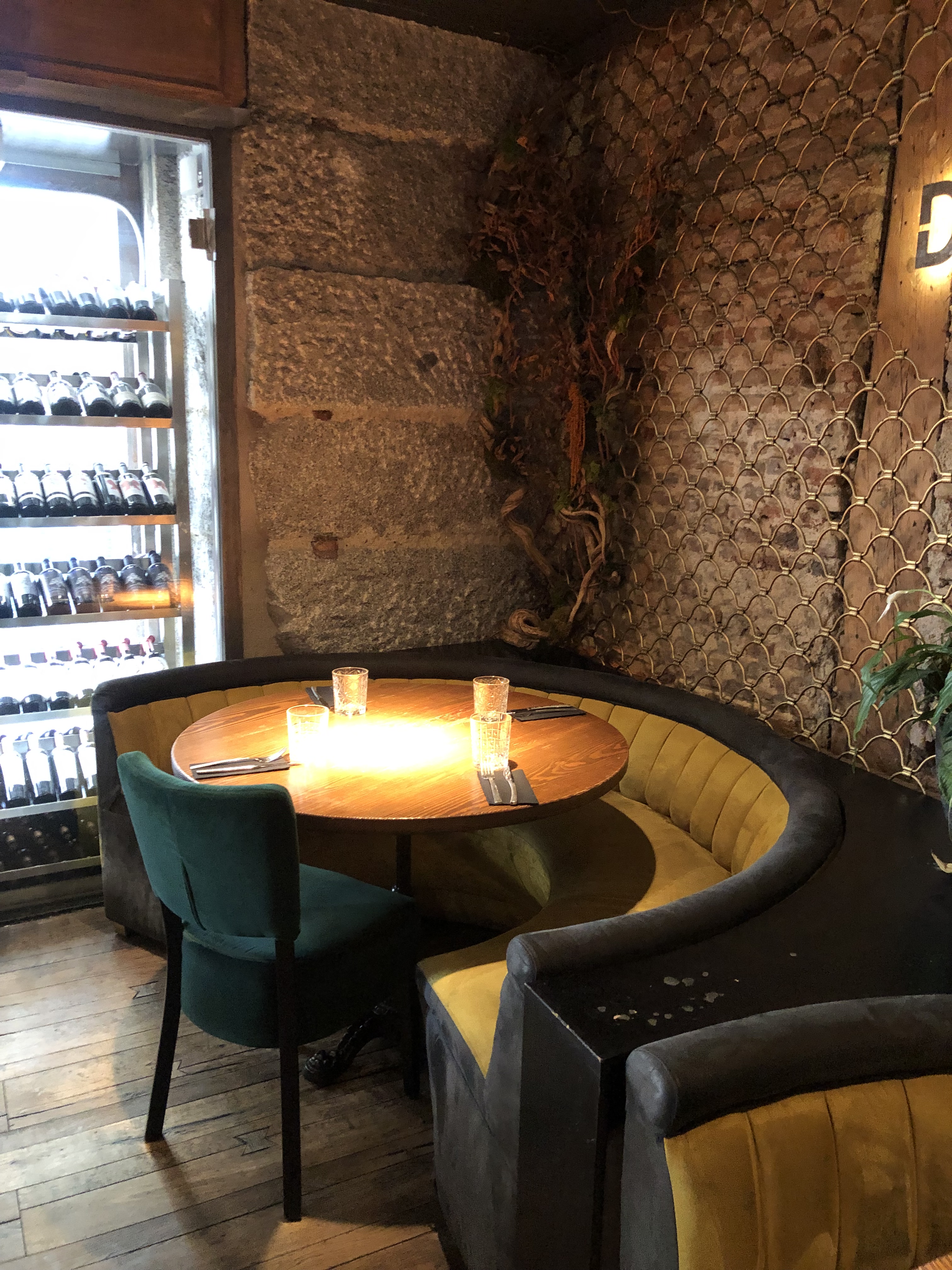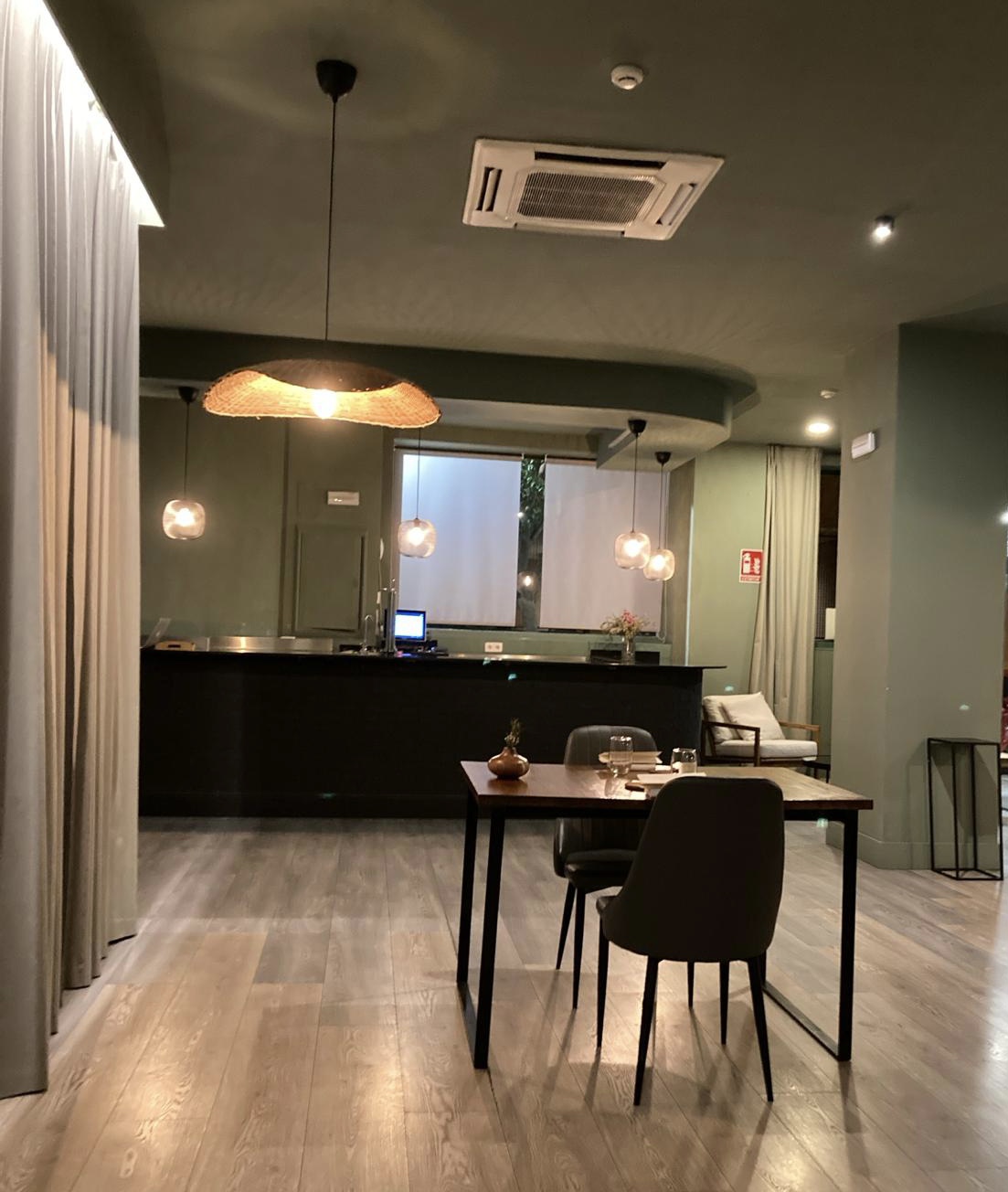 Me gustó mucho la cortina que tienen a lo largo de una de las paredes. No sé lo que esconde, pero desde luego es un buen truco para amortiguar ruidos, tan necesario en locales donde no hay manteles, ni elementos que hagan esa función, y además le da un aire más cálido al ambiente.