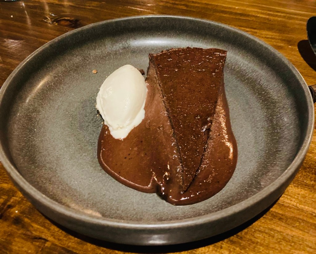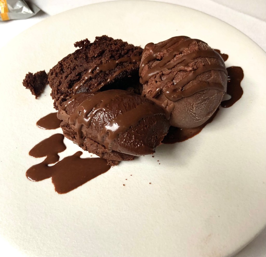 No podía faltar el toque chocolatero con un, Esponjoso de chocolate, grue de cacao y helado de caramelo a la sal
