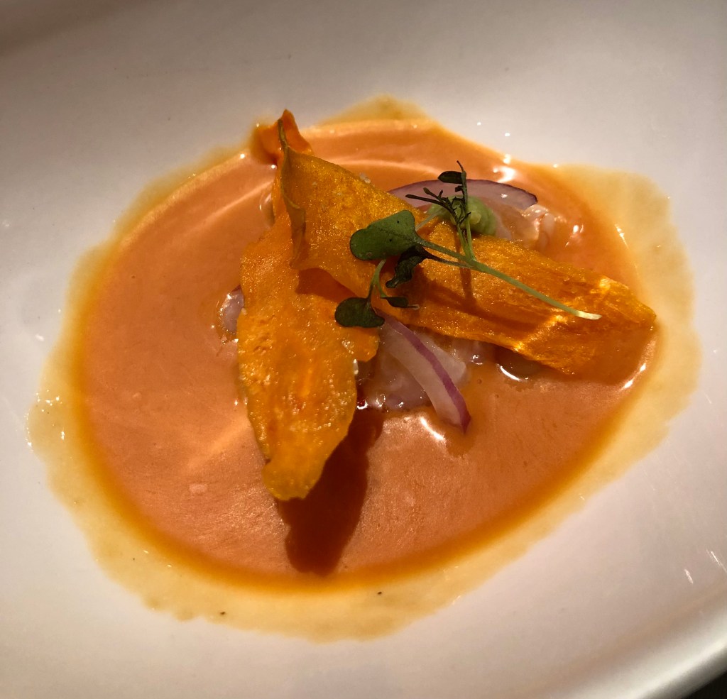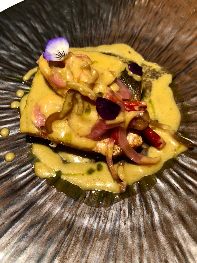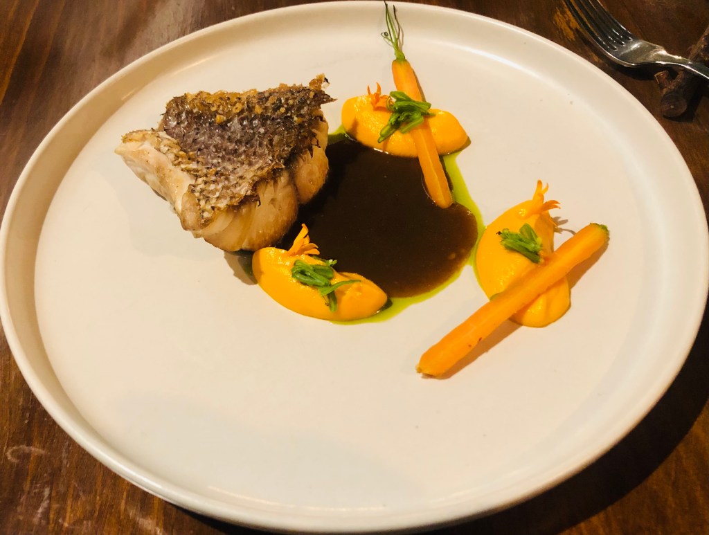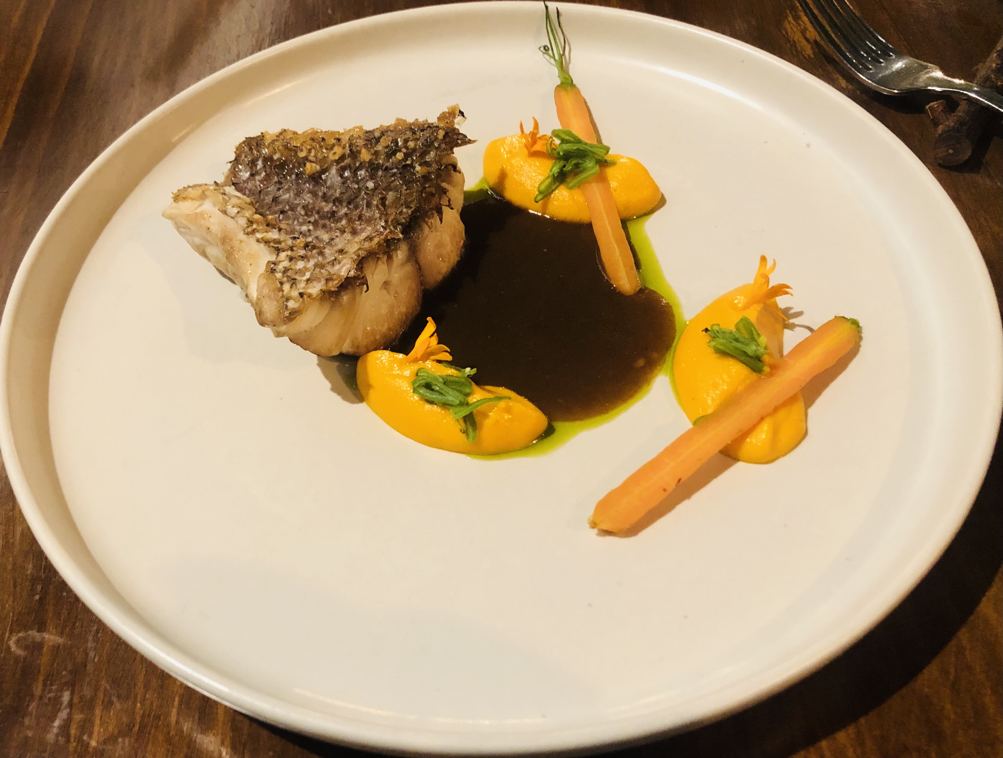 La Urta es un pescado de roca salvaje de la misma familia que la dorada o el sargo, me resultó deliciosa, una carne blanca y sabrosa, acompañada de una original salsa, una exquisita crema de zanahorias y unas diminutas zanahorias de huerta y rematado con un refrescante jugo verde de hierbas.