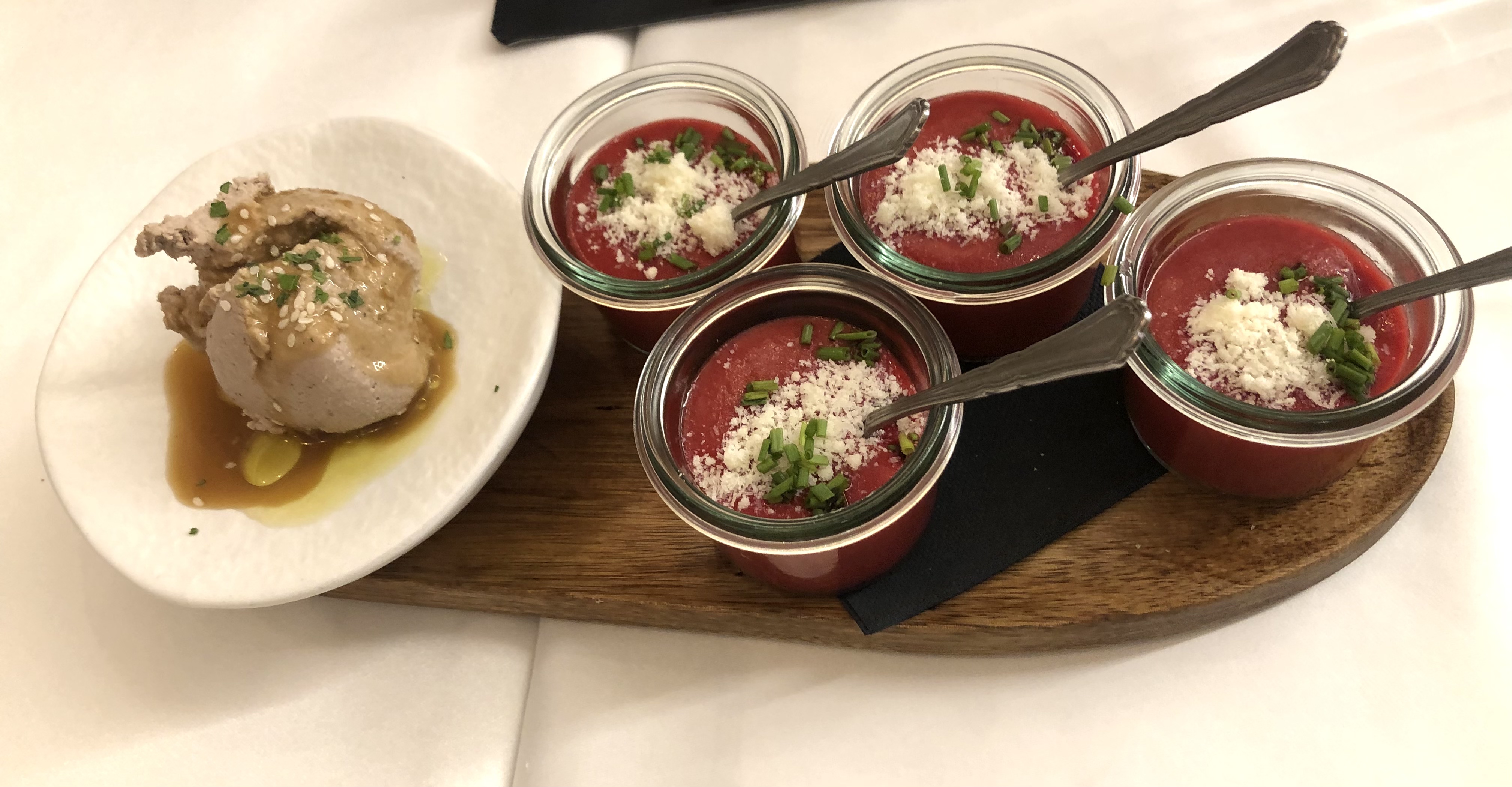 Mientras decidíamos, nos ofrecieron un aperitivo compuesto de un rico paté de la casa y un gazpacho de remolacha con parmesano.