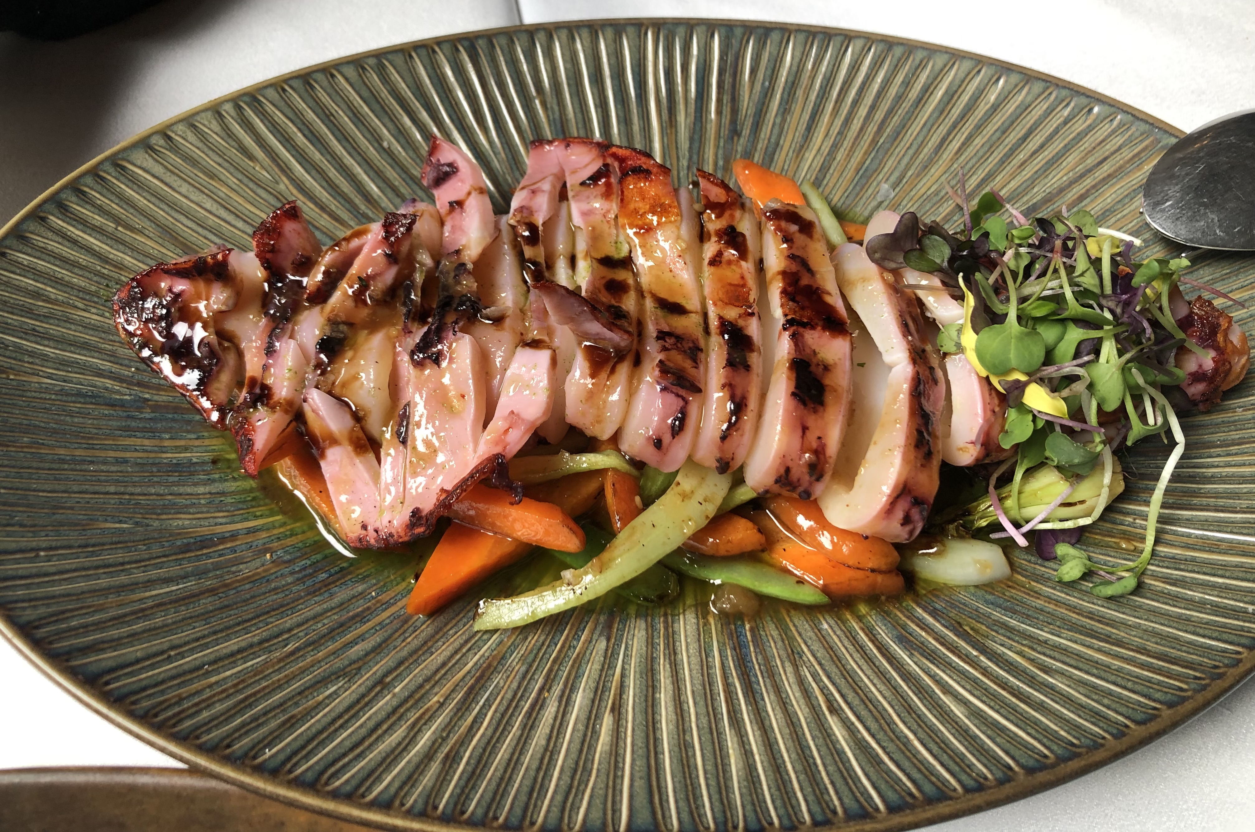 Calamar plancha con verduritas thai. Magnifico acompañamiento esas verduritas en su punto y como el resto, la base de un buen producto.