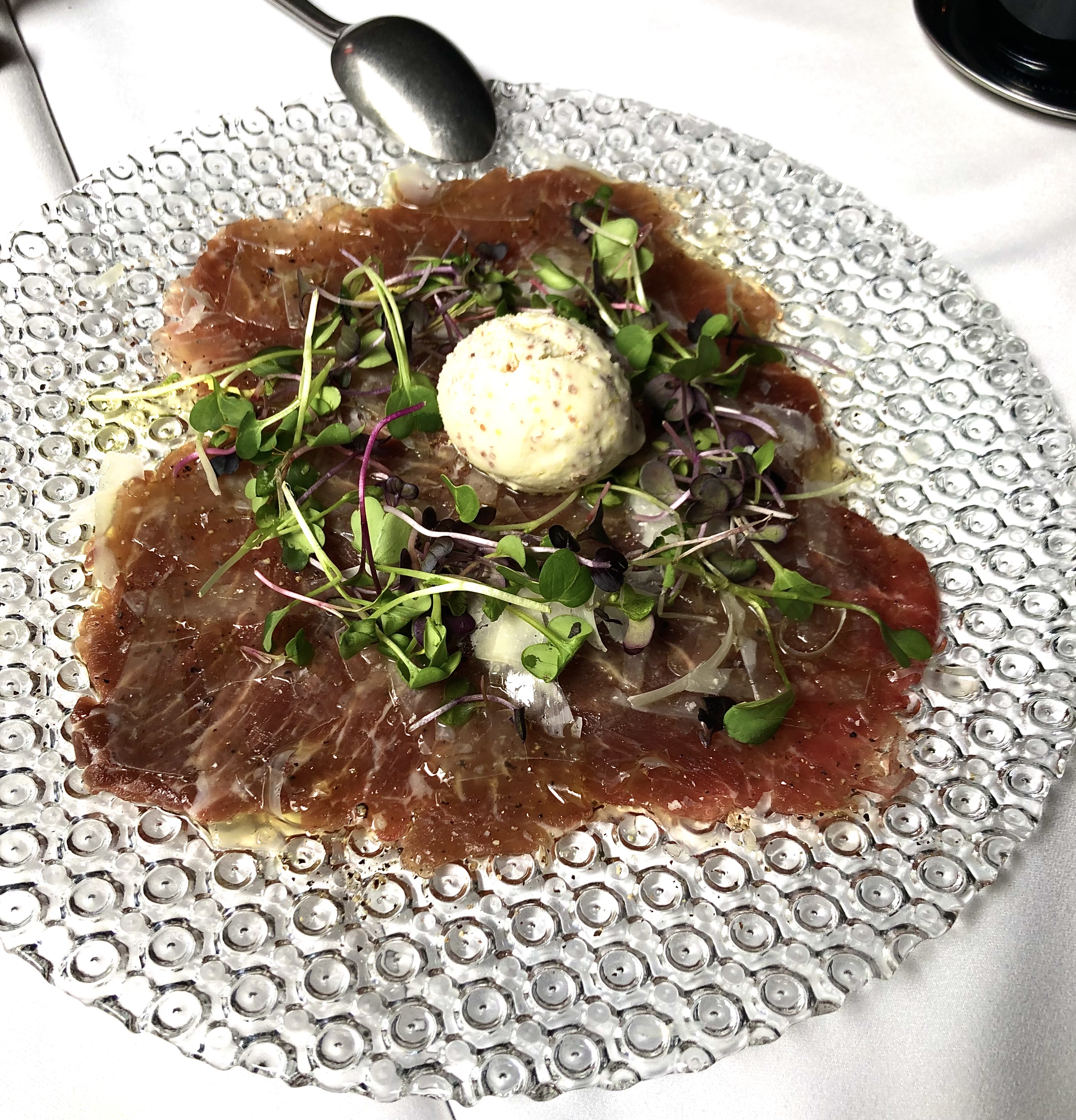 Carpaccio de presa. parmesano y helado de mostaza. Hecho con una magnifica presa ibérica, lo que le da el toque único es el helado de mostaza, un plato de los imprescindibles, si es que se puede elegir alguno.