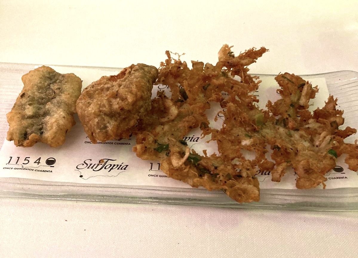 Boquerón en tempura de manzanilla y adobo de ajilimón, Cazón Patanegra en adobo moruno de chiringuito y una Tortillita de camarones.