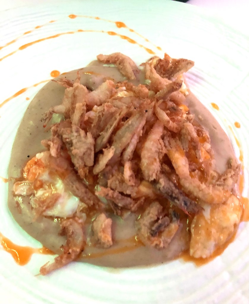 Terminamos la parte de entrantes con Gambita de cristal, patata trufada y huevos fritos cortijeros. Una mezcla maravillosa en la que el pan vuela.
