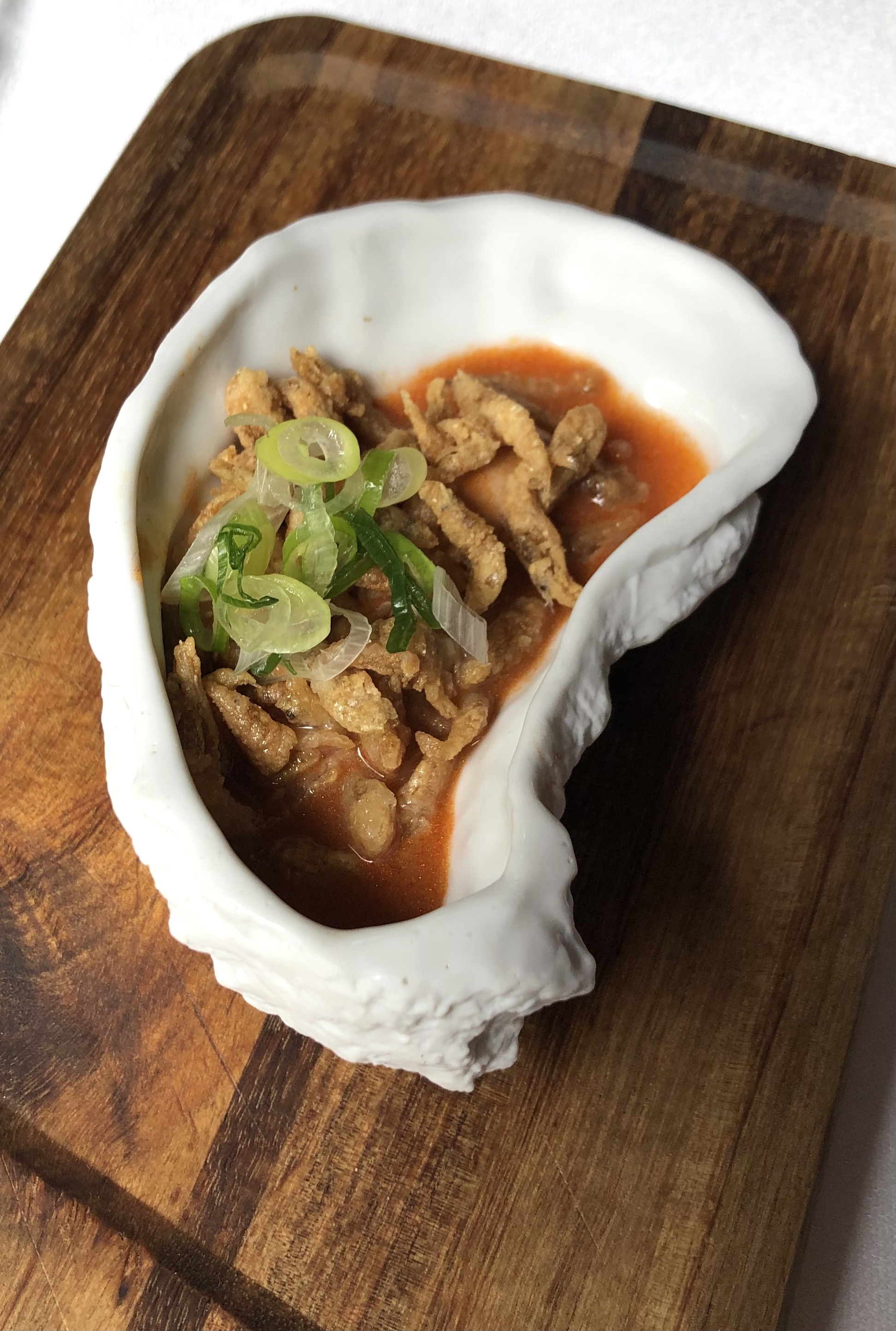 Utilizan para la salsa brava chile morita, pimienta de Jamaica, cardamomo y lima entre otras especias. Una deliciosa mezcla que refuerza el sabor de la oreja y lo hace un bocado muy original.