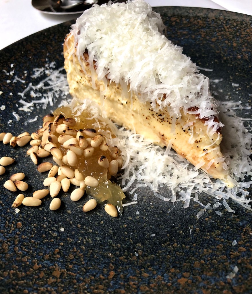 Tarta de queso parmesano y cabello de ángel y piñones. Una de sus diferencias es el sabor que le da el queso parmesano y su toque peculiar el cabello de ángel y los piñones que la hacen especial