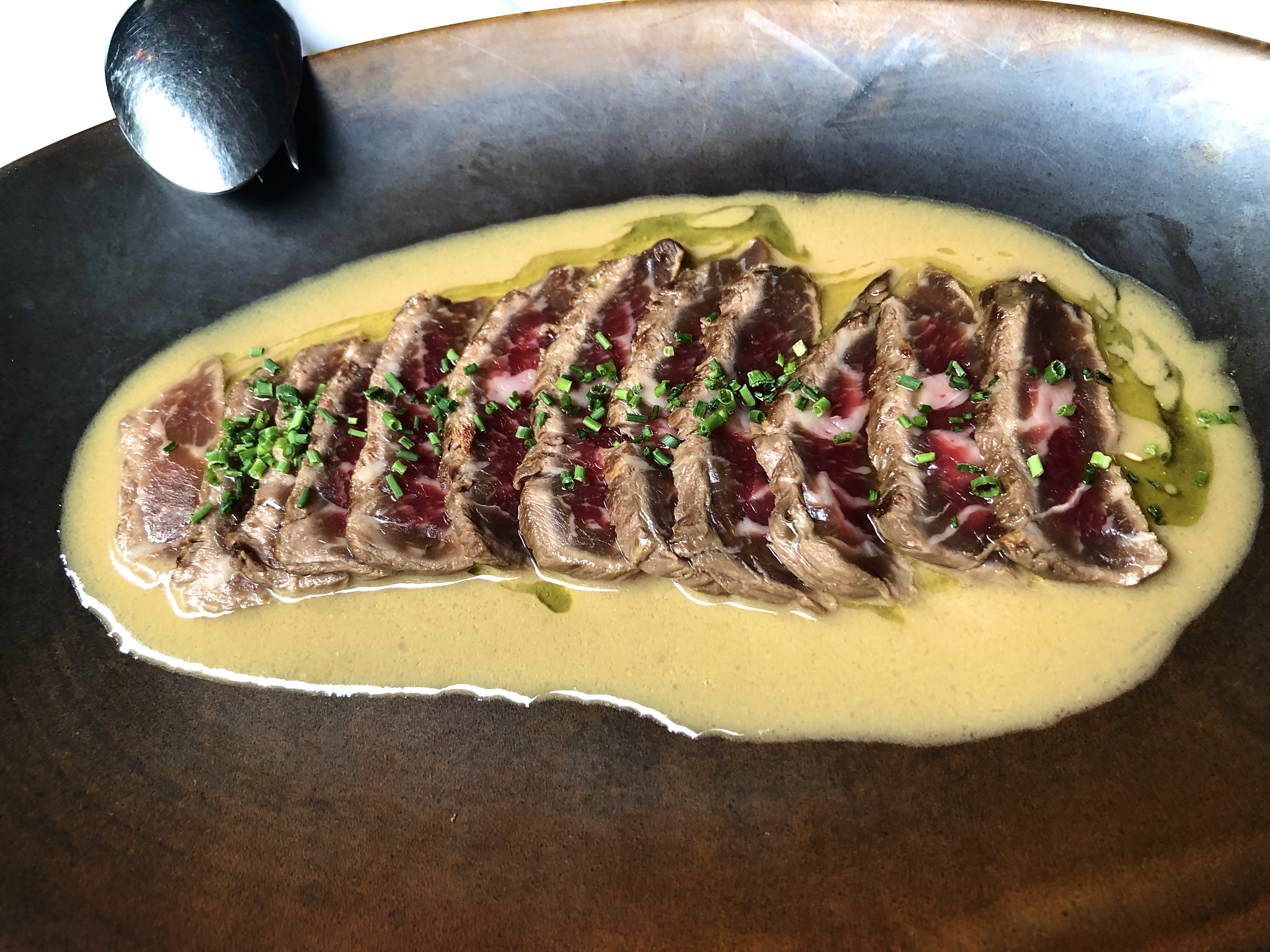 Tataki De Angus marinado con café y lima, salsa de limón marroquí. Una estupenda carne con el toque indio del café con la que la marinan y la salsa de limón de Marruecos, esa fusión de culturas que le gusta tanto al chef.