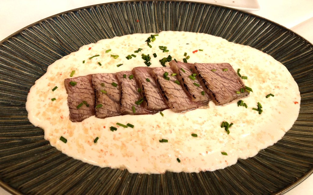 Ventresca de atún rojo a la llama con ajo blanco y botarga. Un extraordinario producto que se eleva con el ajo blanco y la botarga un imprescindible de la gastronomía mediterránea.