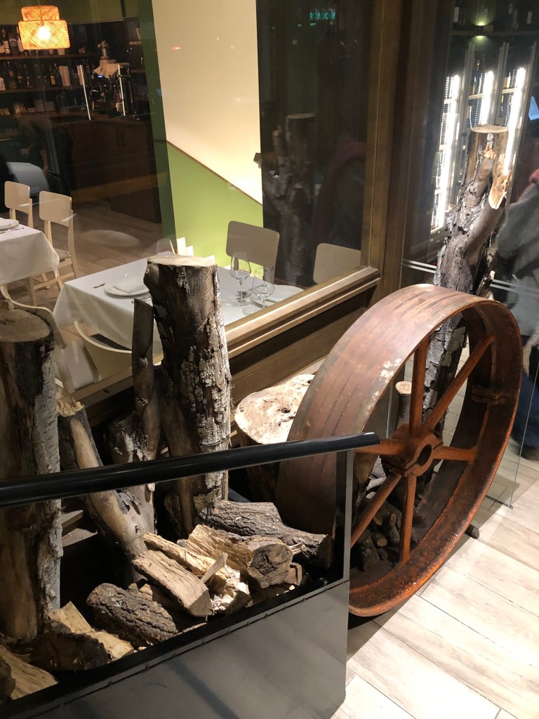 Un local acogedor, con una decoración en colores neutros y mesas vestidas y el detalle de troncos rústicos salpicados aquí o allá en distintos rincones del local, como anticipo a esa mezcla en la cocina de lo rústico del carbón y cierta creatividad contemporánea en las elaboraciones.
