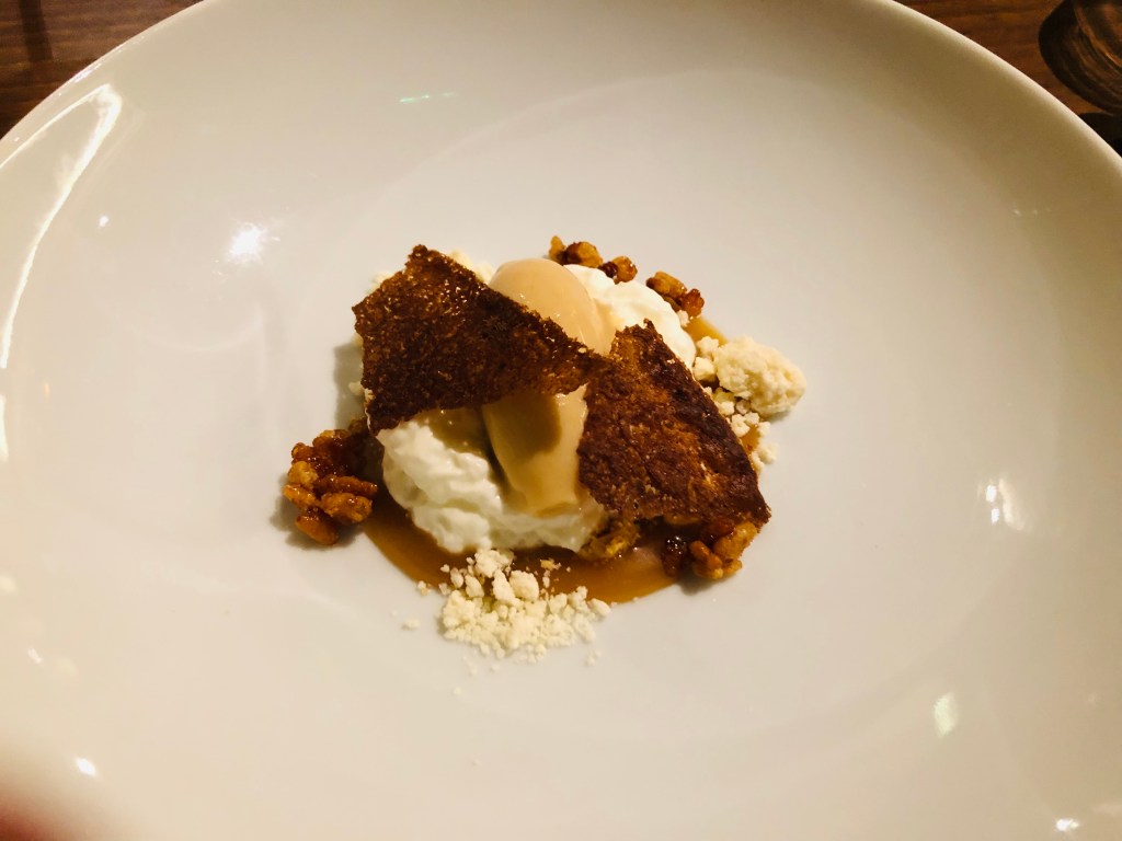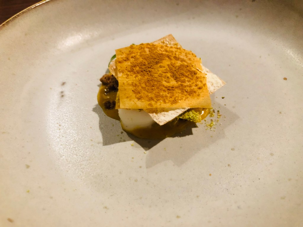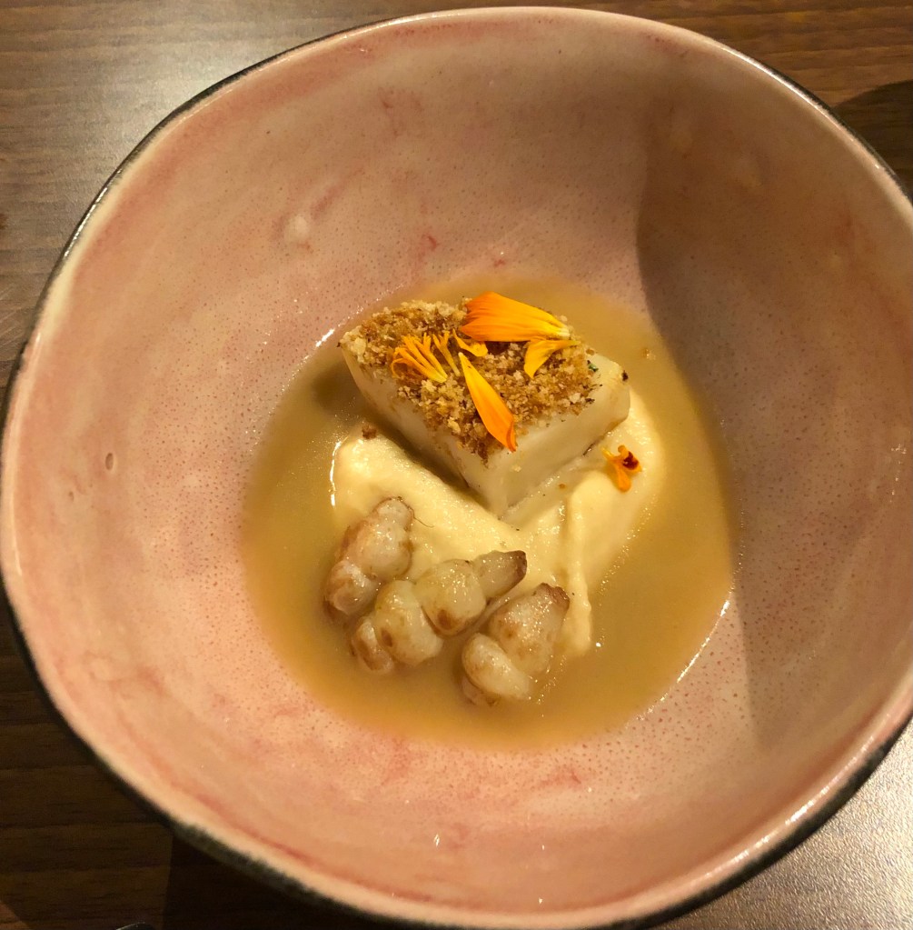 Seguimos con Apio, chirivía, crosnes y limón. Un paso vegetal del menú, todo delicadeza una especie de puding suave lleno de matices.